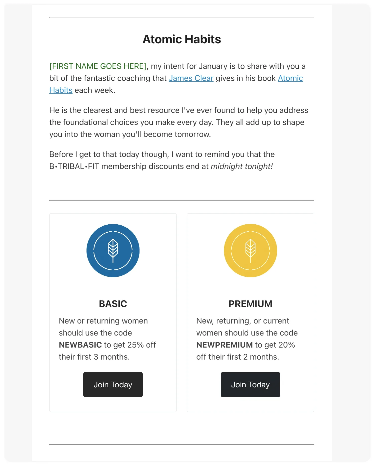 While they’re currently working on growing their email list, the focus is still on a holistic, multichannel campaign that serves their community. A few years ago, they hit on the idea of a 21-day challenge three times a year as a way to rev up their clients and grow their list at the same time.
