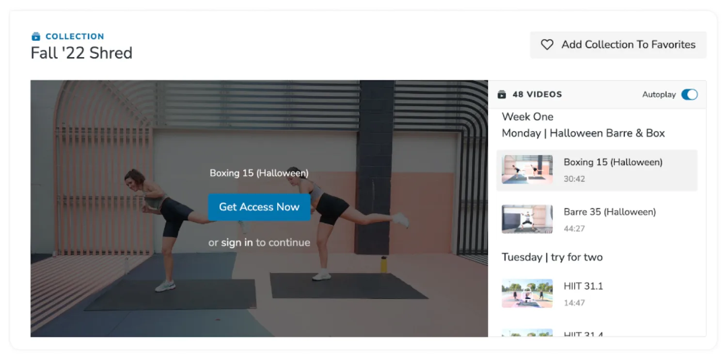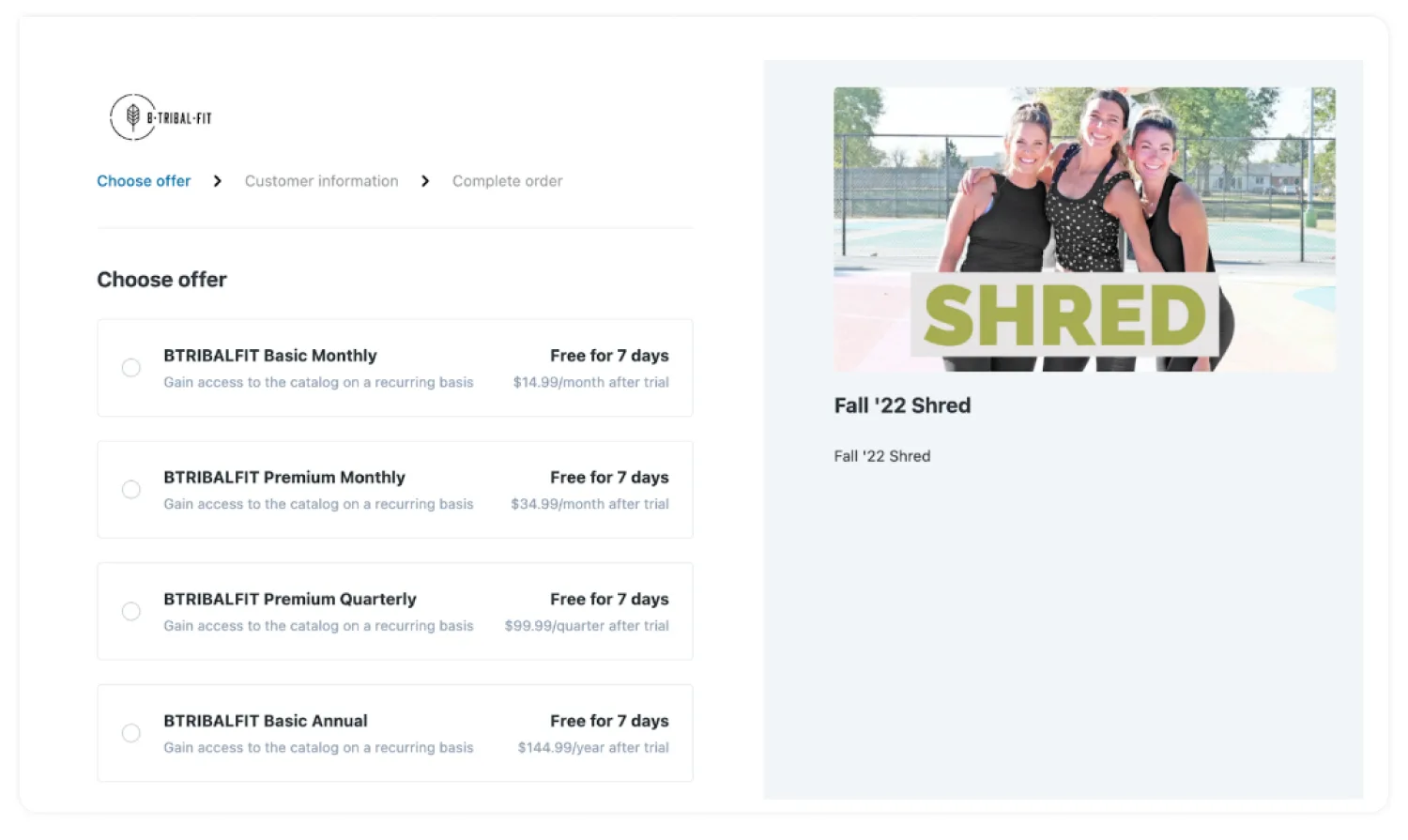 The challenge starts with a landing page made in Kit that hosts each of the workouts, with a prompt to sign in to view the videos. From there, that takes you to a Commerce page offering their various workout packages and a seven-day free trial.