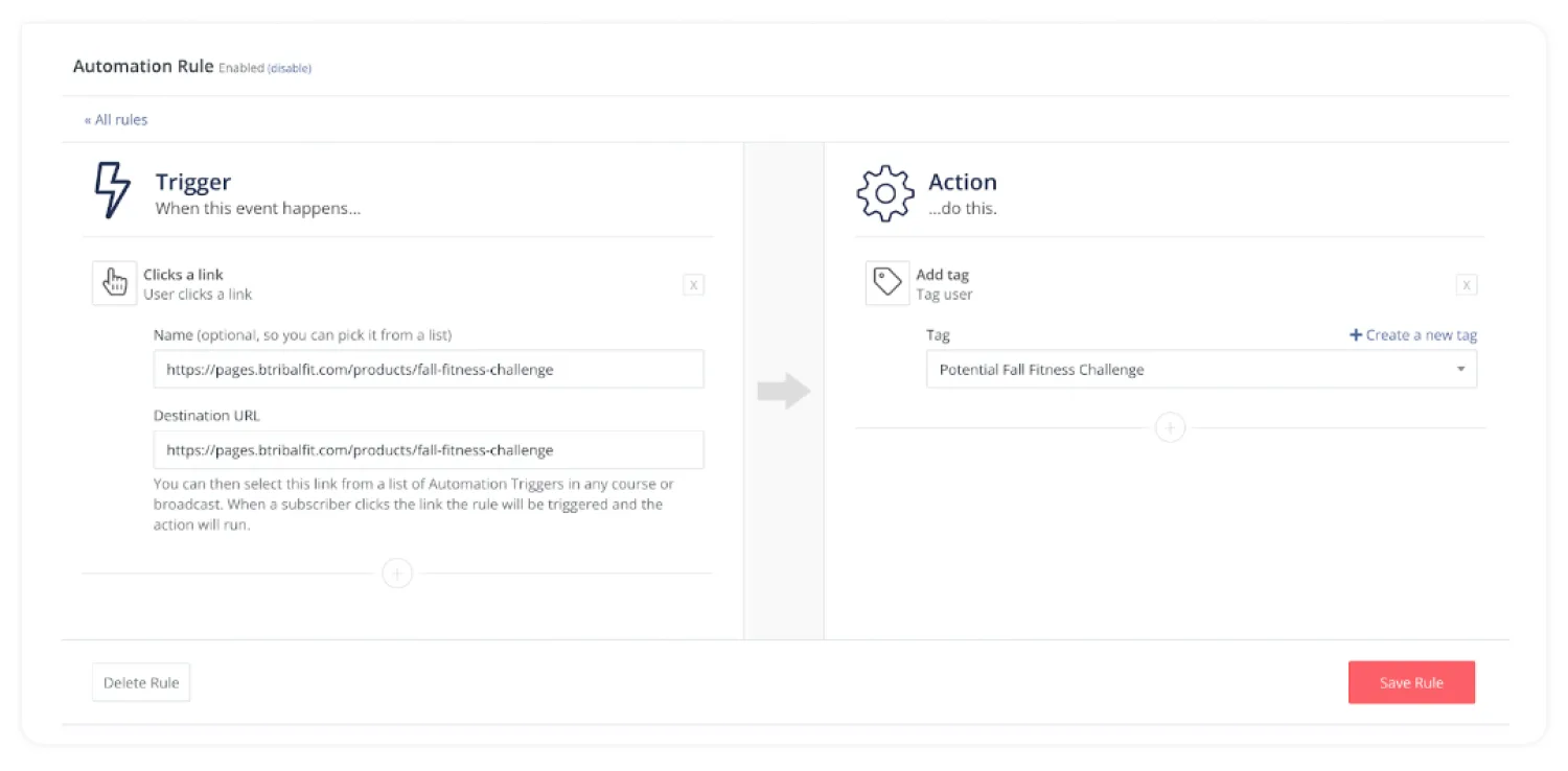Before the challenge gets going, they promote it in their regular newsletter, automatically tagging anyone who clicks on the link to sign up as interested on the back end in Kit. Anyone with that tag gets dropped into a Kit sequence of more directed emails promoting the challenge.