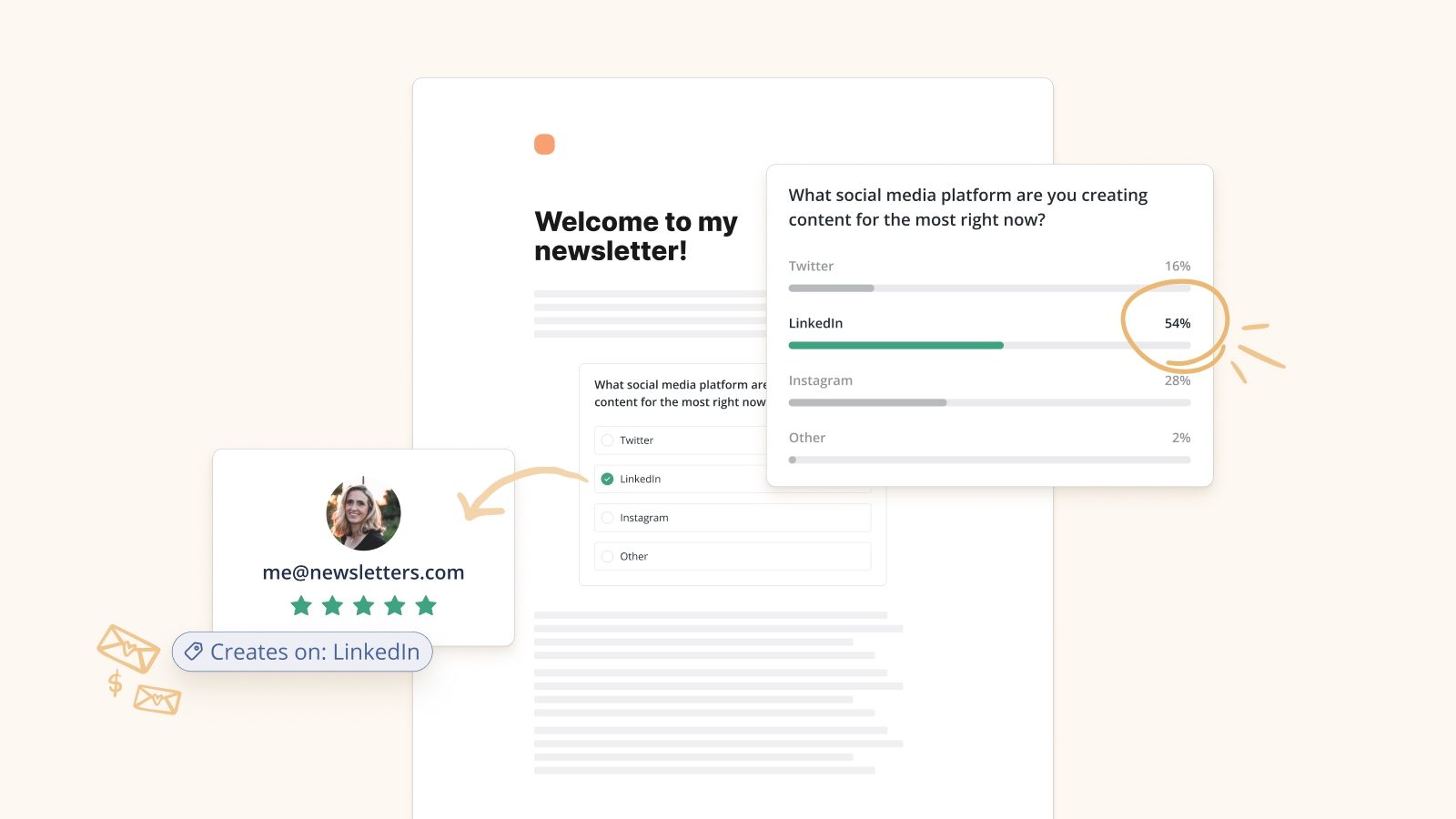 Set up Polls directly from your Kit email editor to engage with and collect information about your subscribers, which you can later use to build segmentations.