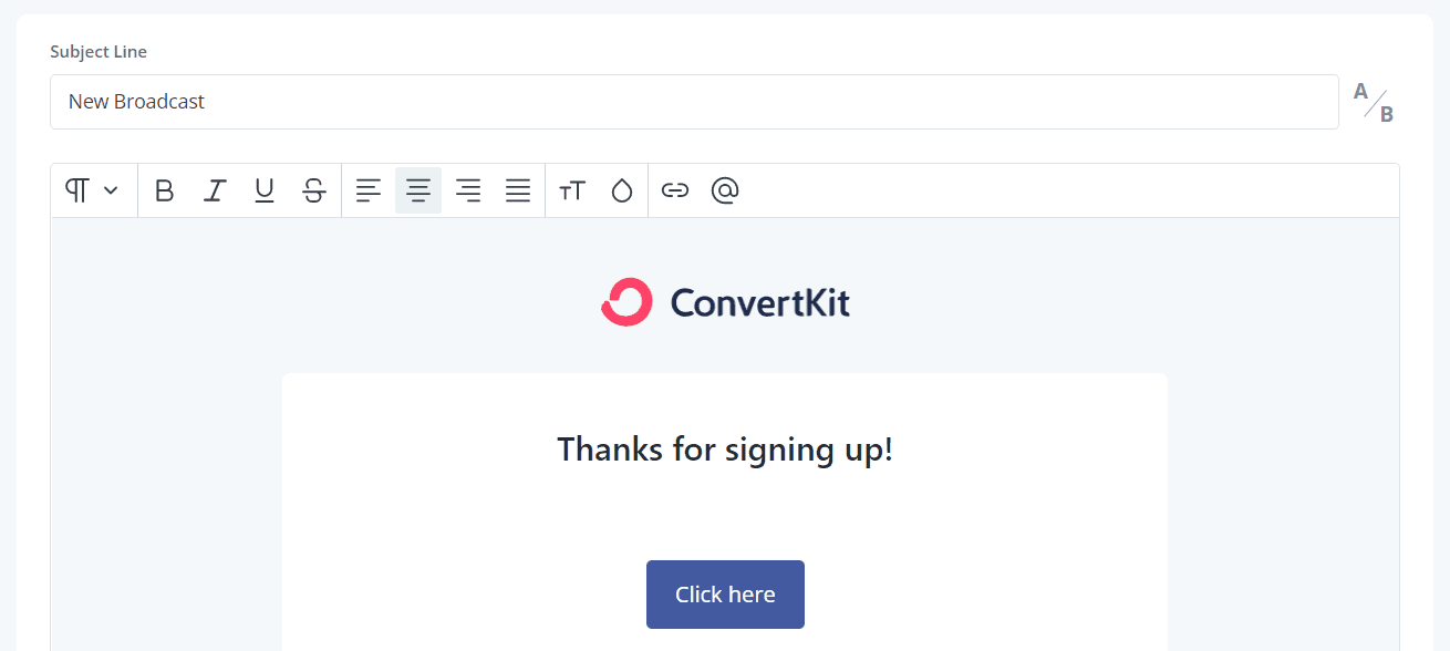 With Kit, you can also A/B test your subject lines. To start, click on A/B beside the subject line input: