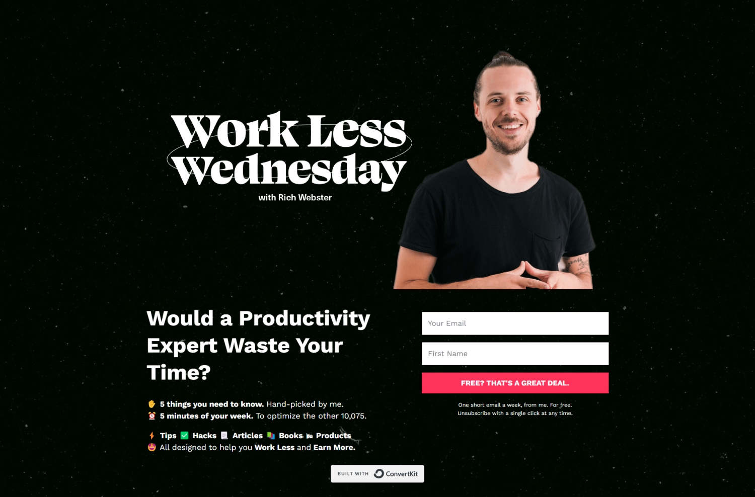 A landing page is a dedicated page you use to turn people into subscribers. Productivity expert Rich Webster promotes his newsletter through this simple landing page: