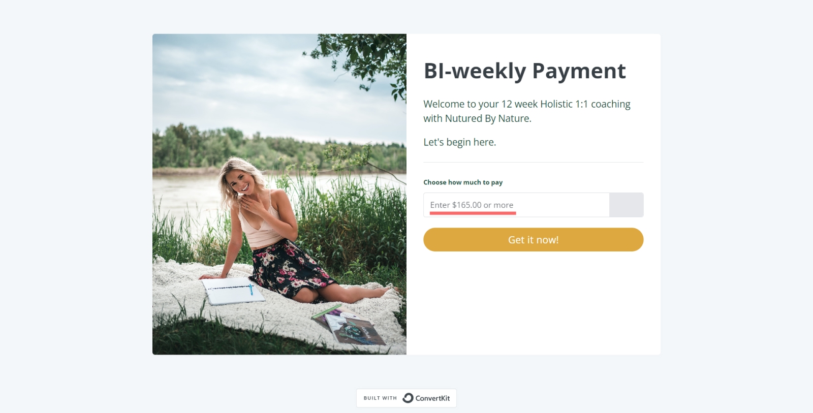 Coach Nurtured by Nature sells 1:1 coaching sessions with a PWYW price. However, they set the minimum price to $165, ensuring they don’t get less than that for a 1:1 session.