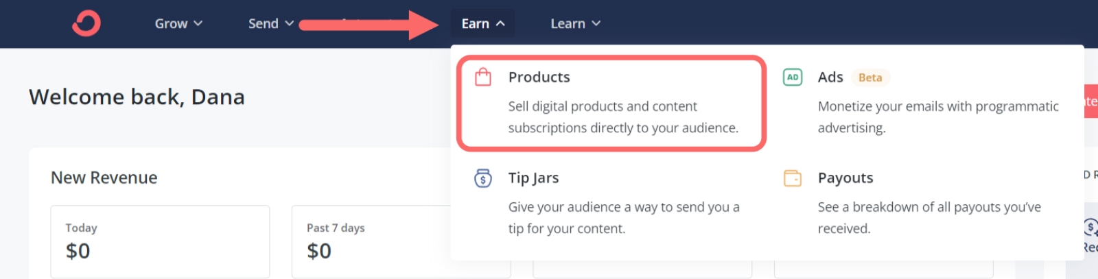After logging into Kit Commerce, click Earn > Products.