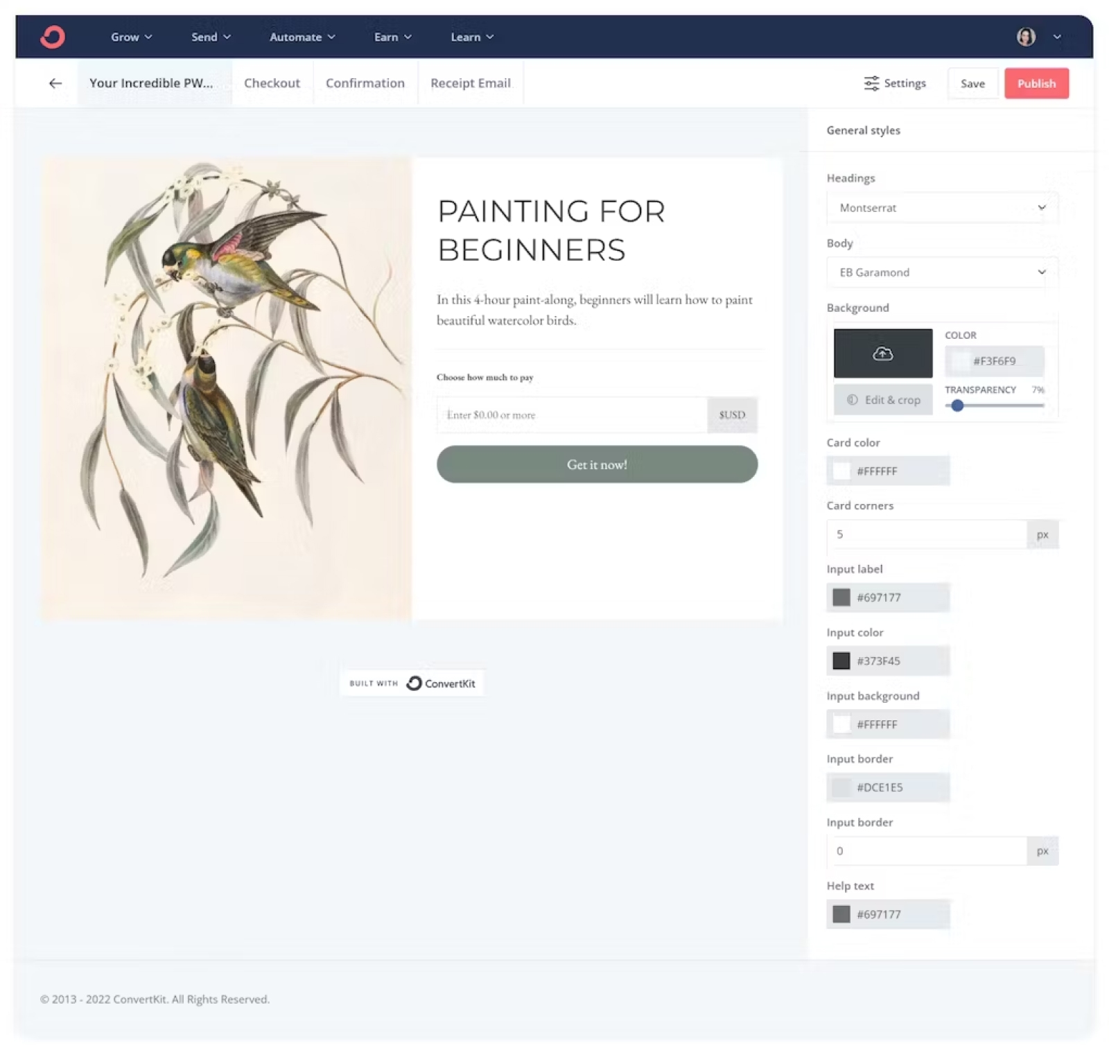 Next, customize the product details, checkout and confirmation page, and receipt email. You can add your own imagery, adjust the colors to match your color palette, and select from different fonts to match your brand.