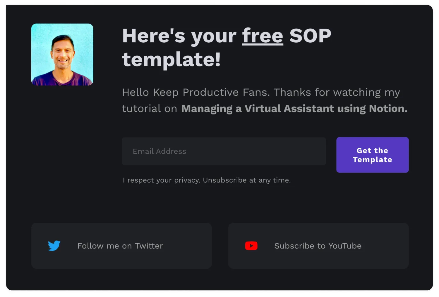 In this video, Khe took the Keep Productive viewers through a Notion dashboard for hiring and working with a virtual assistant. Khe also took an extra step: he built a dedicated landing page for a free template he mentioned in the video.