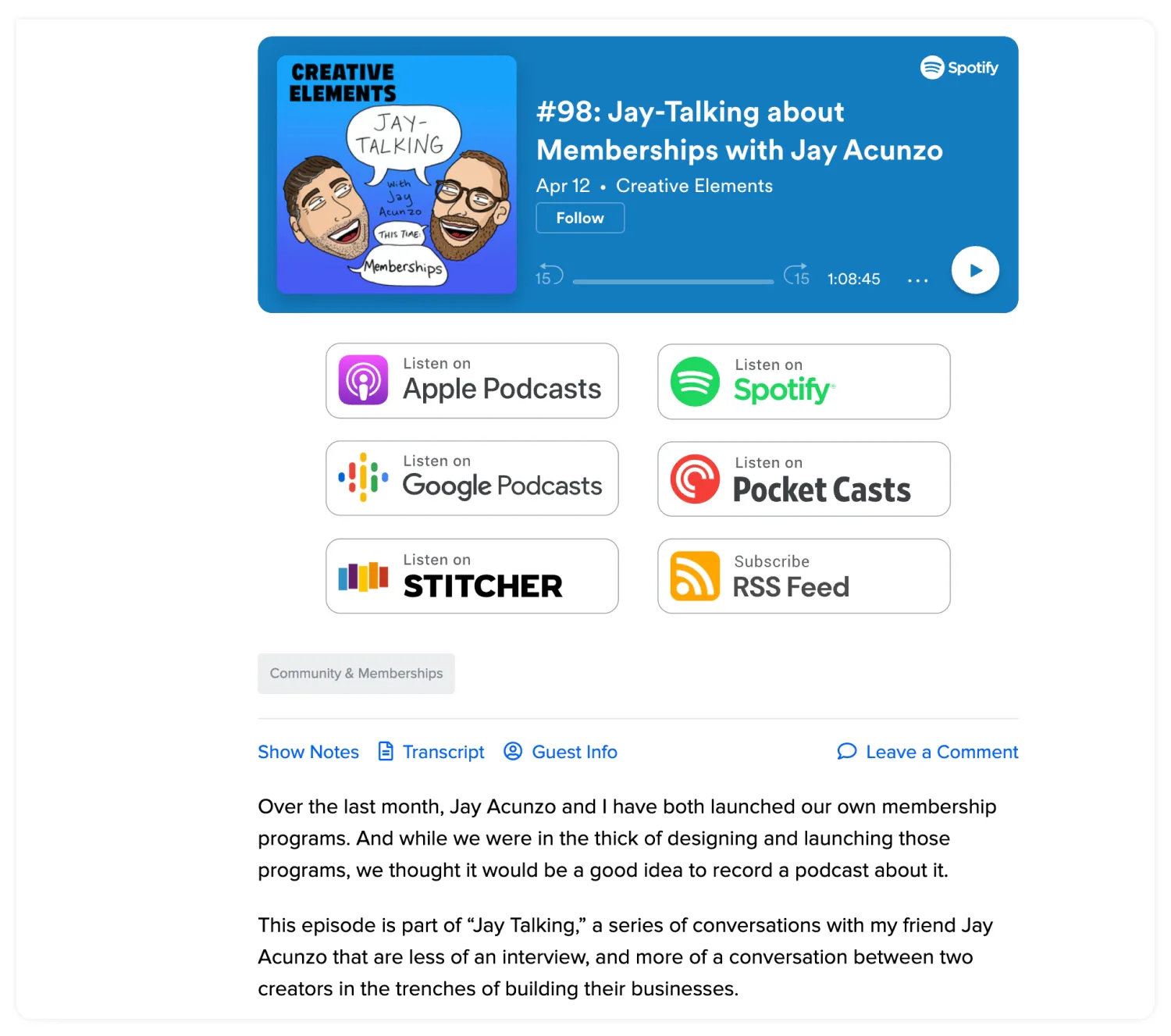 After the first time Acunzo appeared as a guest on Clouse’s podcast in mid-2021, he appeared several more times. They’ve now talked about speaking, resonance, and paid memberships amongst other topics. They’ve named this series “Jay Talking,” which includes episodes that are “less of an interview, and more of a conversation between two creators in the trenches of building their businesses.”