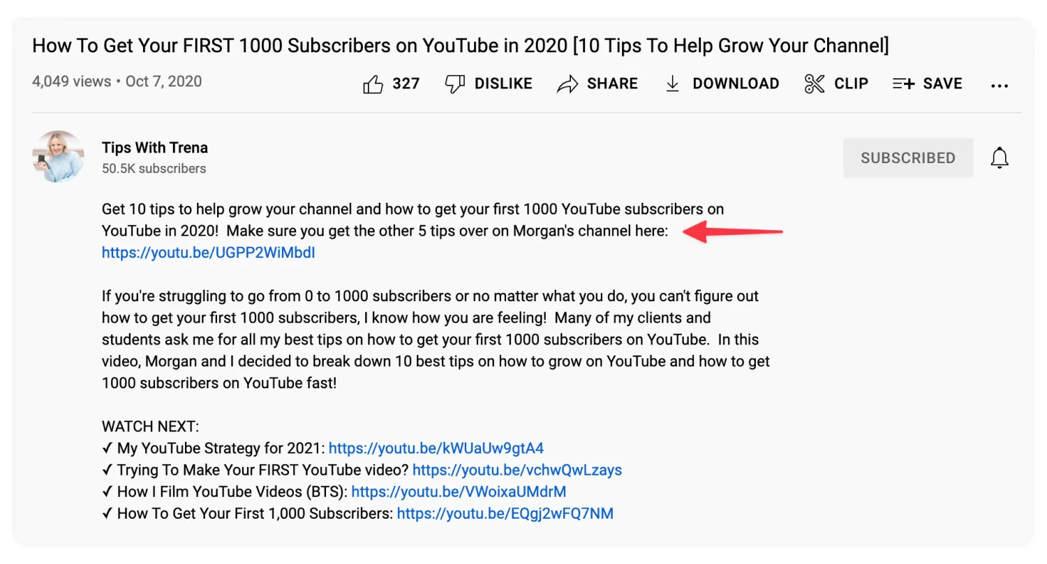 The same structure follows on Morgan’s channel. They both list links in the video description that take viewers to the other five tips on the other creator’s channel.