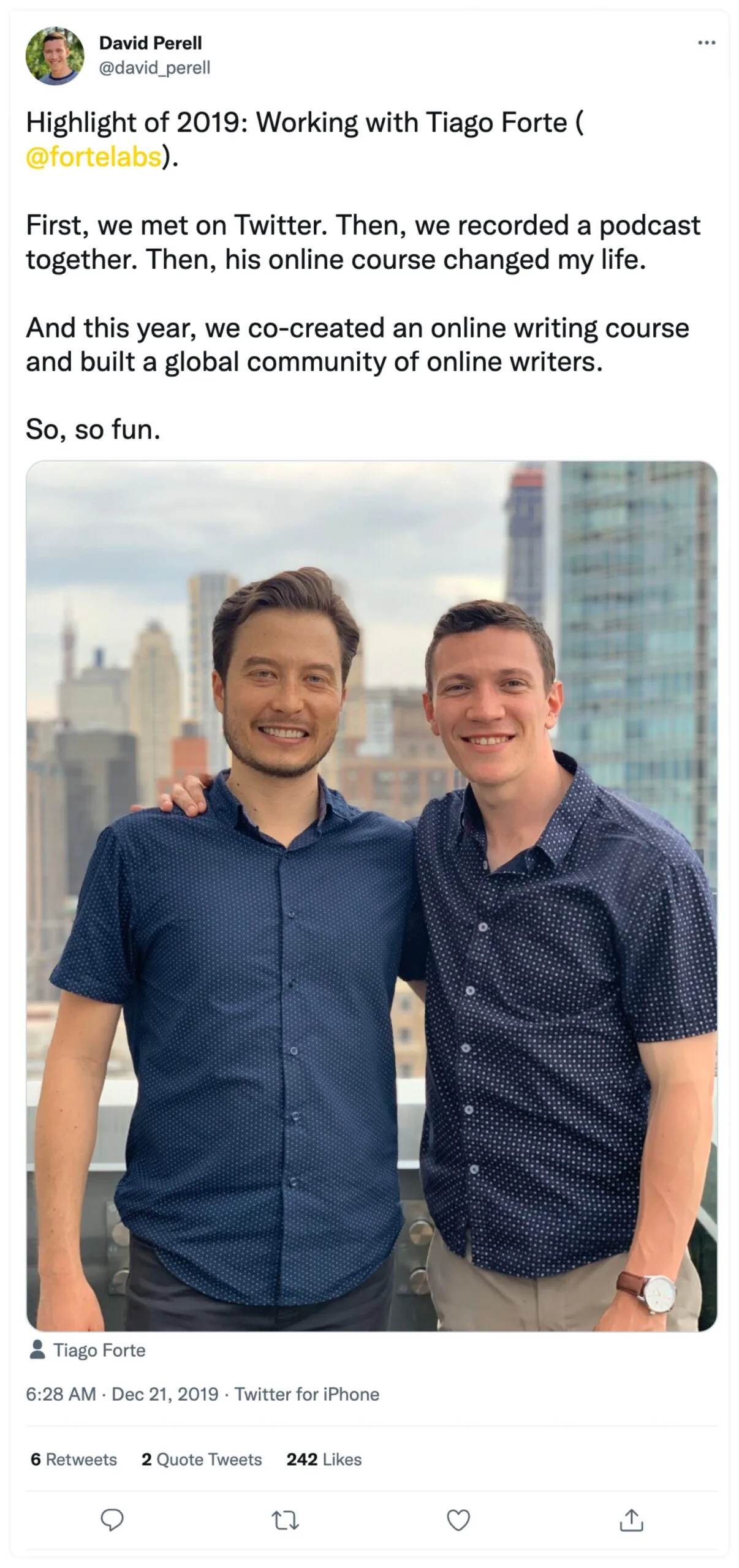 The short story of how David Perell and Tiago Forte got to work together. Image via David Perell.