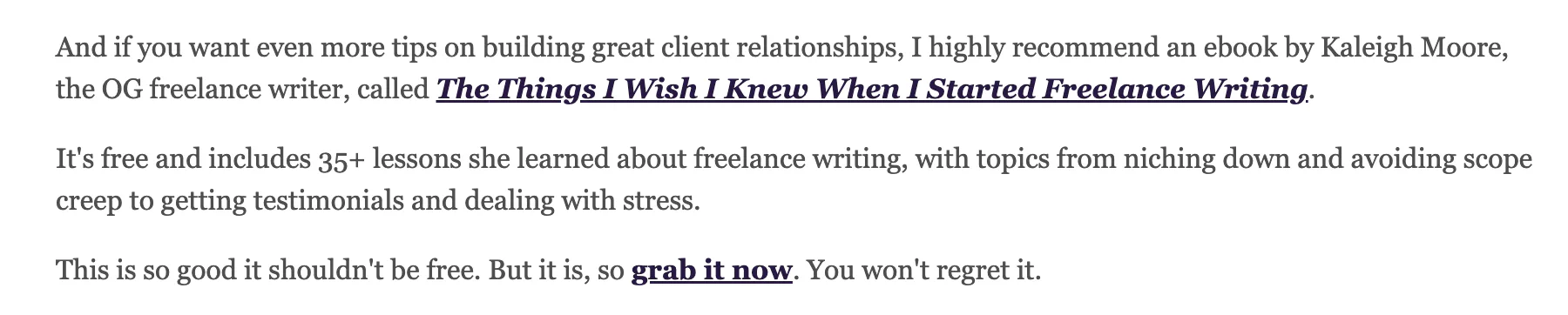 In her email, Kaleigh shared a link to my landing page with free, downloadable email templates for freelance writers. In my newsletter, I’ve shared Kaleigh’s free ebook with dozens of lessons she learned about freelance writing.