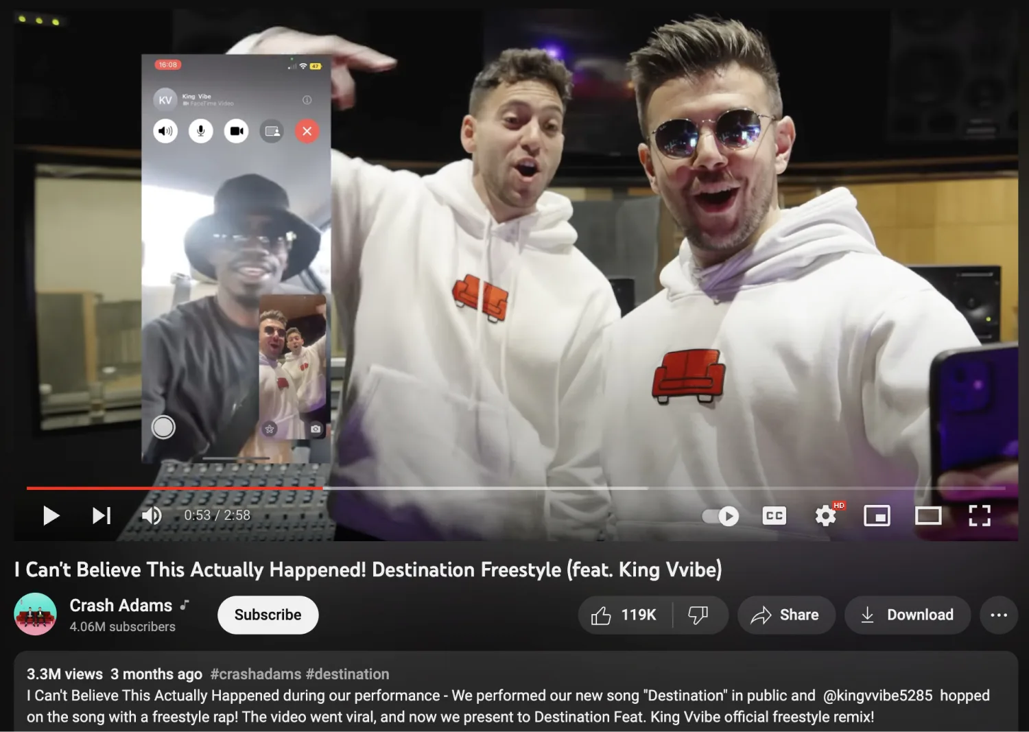 Sometimes creators meet collaborators by chance, like the musical duo Crash Adams and KingVvibe. KingVvibe freestyled with Crash Adams in a video that went viral. Hundreds of thousands of viewers and commenters wanted to see more of the collaboration.
