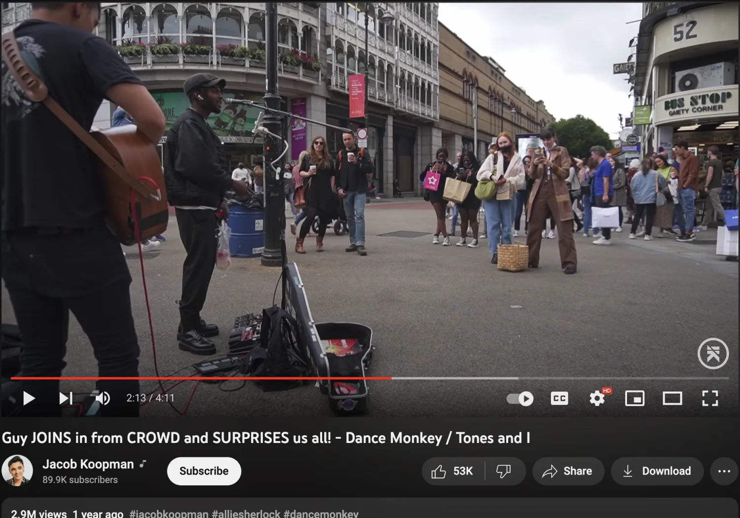 Similarly, Jacob Koopman was busking when VJ Jaxson asked to join in. The collaboration was a hit, and the video garnered nearly 3 million views on YouTube.