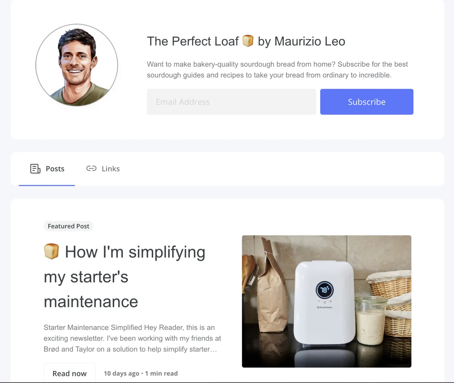 Your creator profile includes past emails, social media links, and a place to subscribe to your newsletter. Image via The Perfect Loaf.