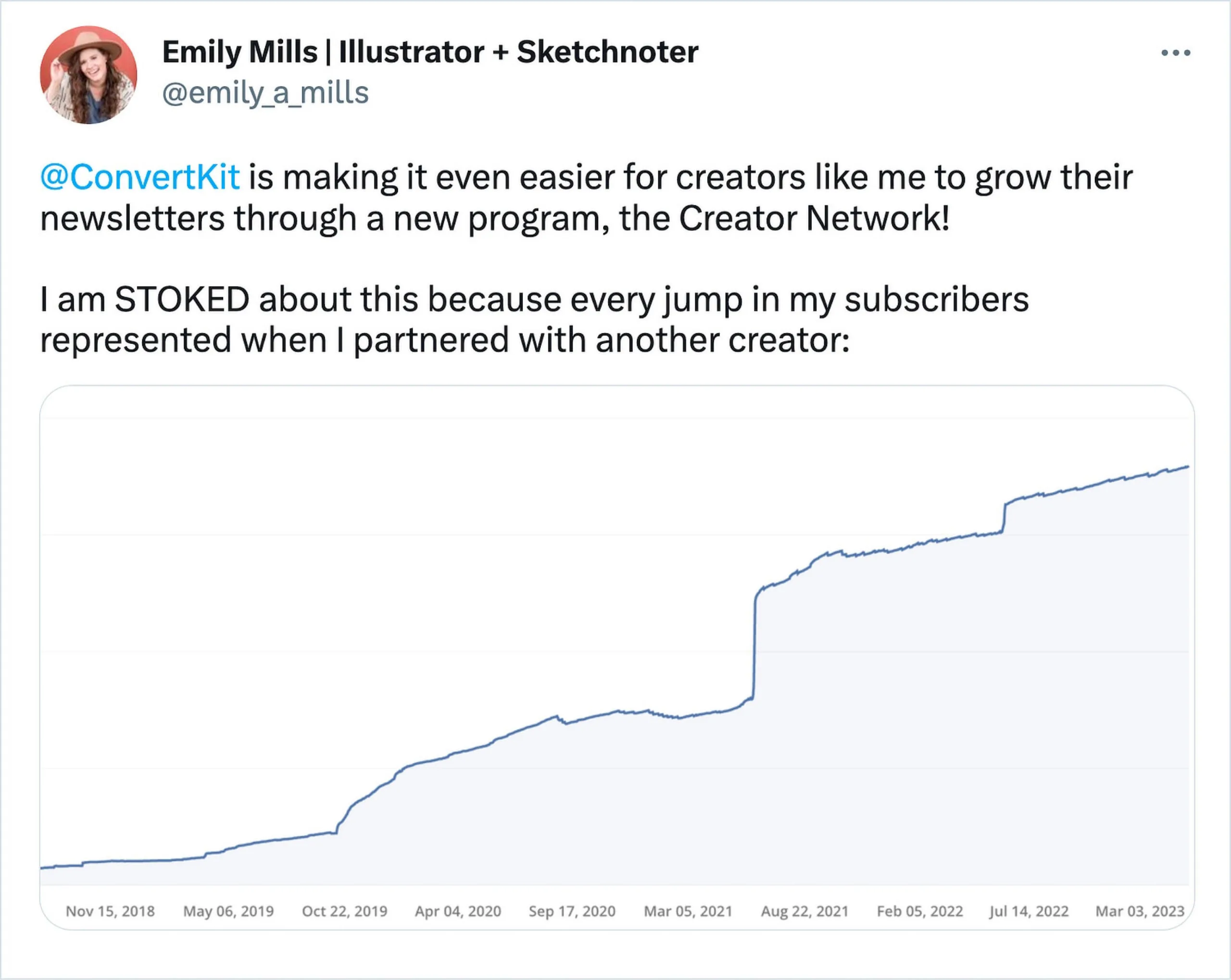 Emily Mills, an illustrator and sketchnoter, started building her newsletter with the hope that it would one day allow her to make a living online doing what she loves. While she was making progress with her own strategies, her list growth accelerated every time she partnered with a creator.