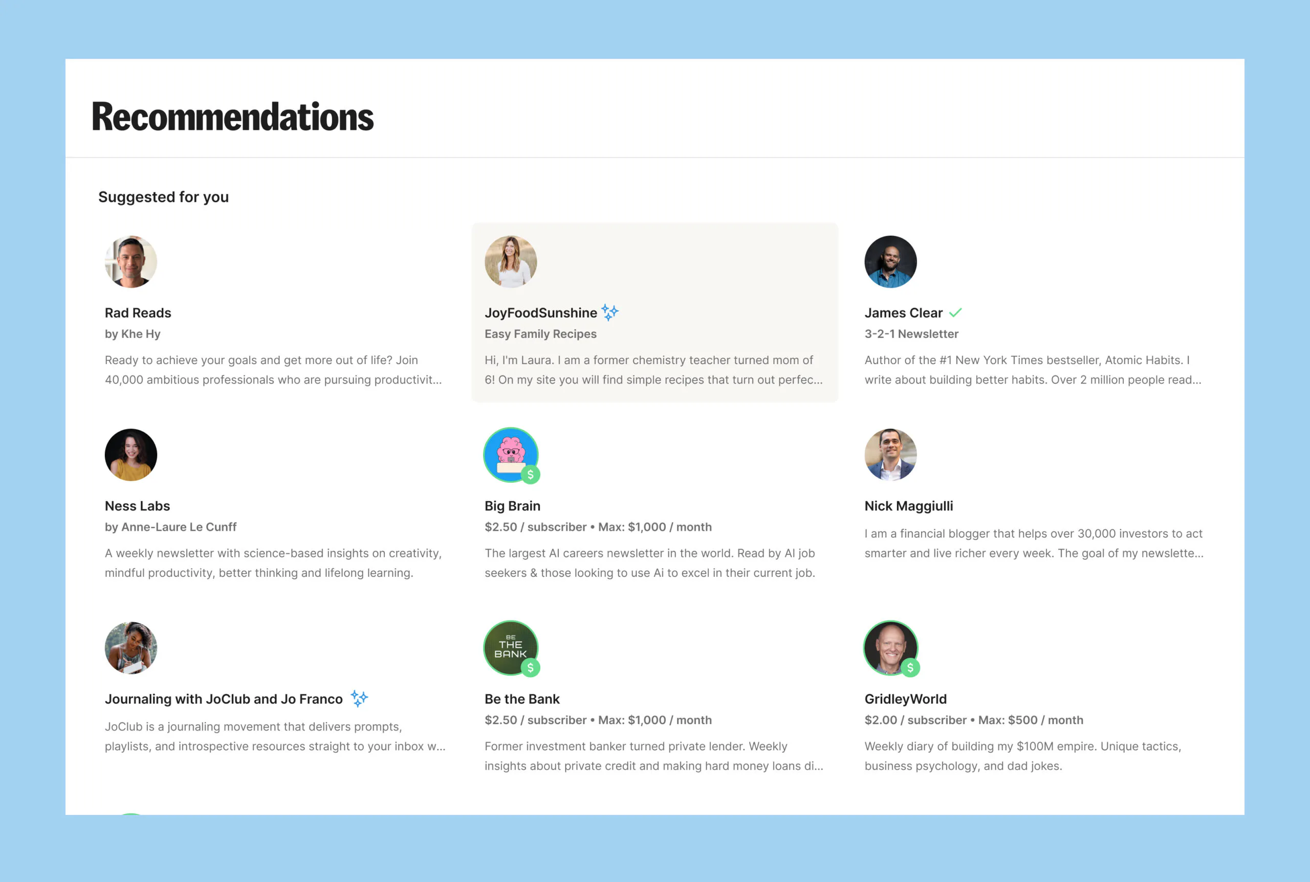 - Smart Recommendations: Giving our paid customers an extra boost to help them grow their list through recommendations. Paid customers can also see which creators are helping them grow, making it easier to connect and recommend those creators back.