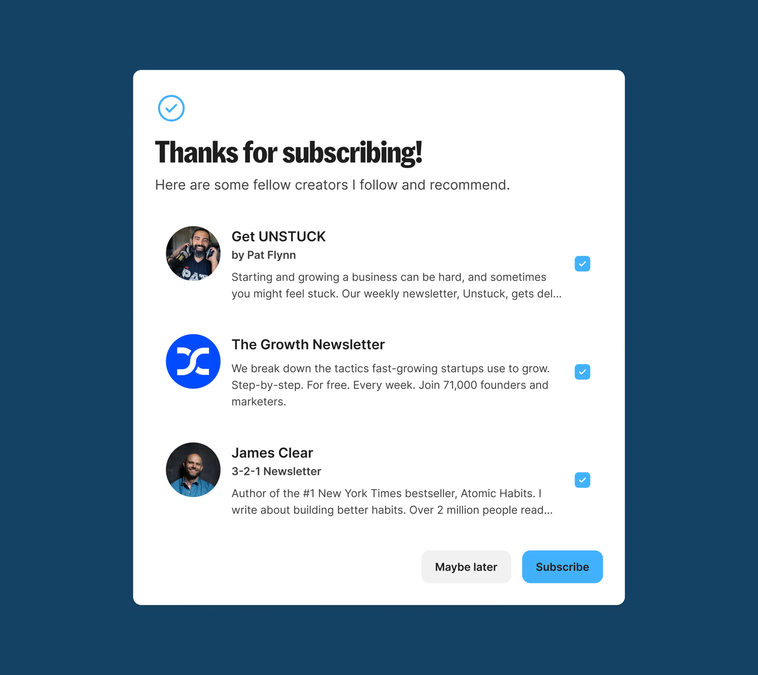 When you recommend another creator, the recommendations modal pops up right after someone subscribes to your newsletter. So, when you grow your list, you’re helping others grow theirs, too.