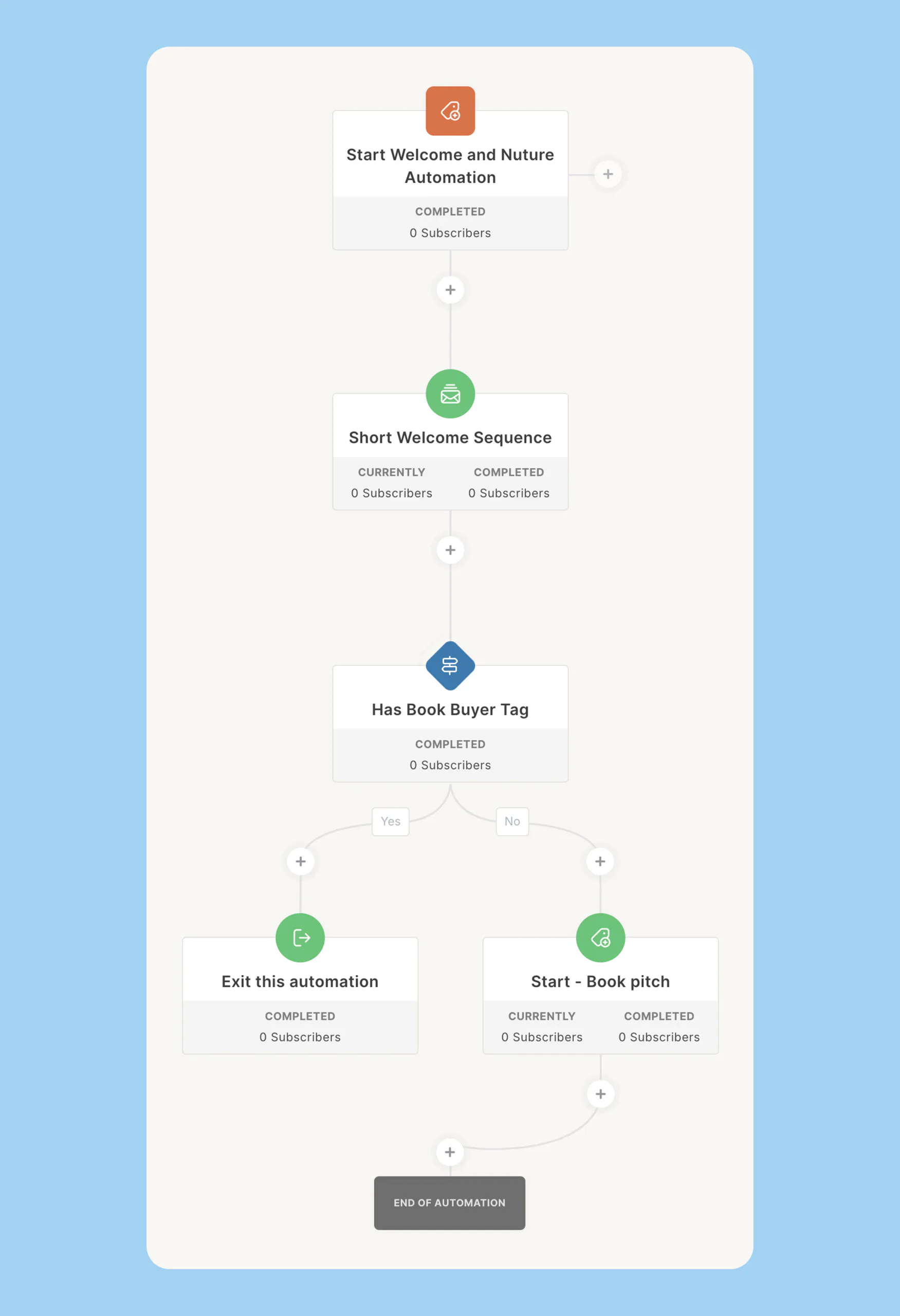 - Add the exit logic. At the end of the sequence, the automation checks: Does this subscriber have the “Book Buyer” tag?