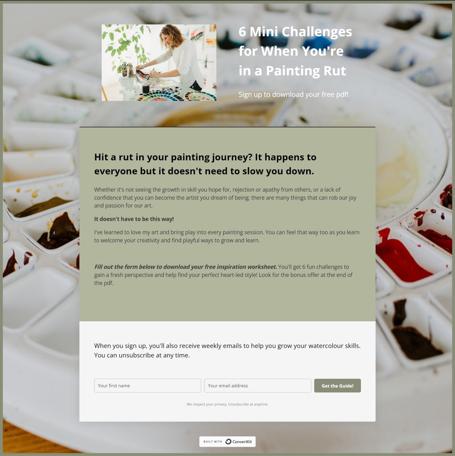 Instead, create lead magnets that attract a targeted group of people. Artist Angela Fehr’s lead magnet isn’t just for artists; it’s for watercolor painters who are stuck in a rut.