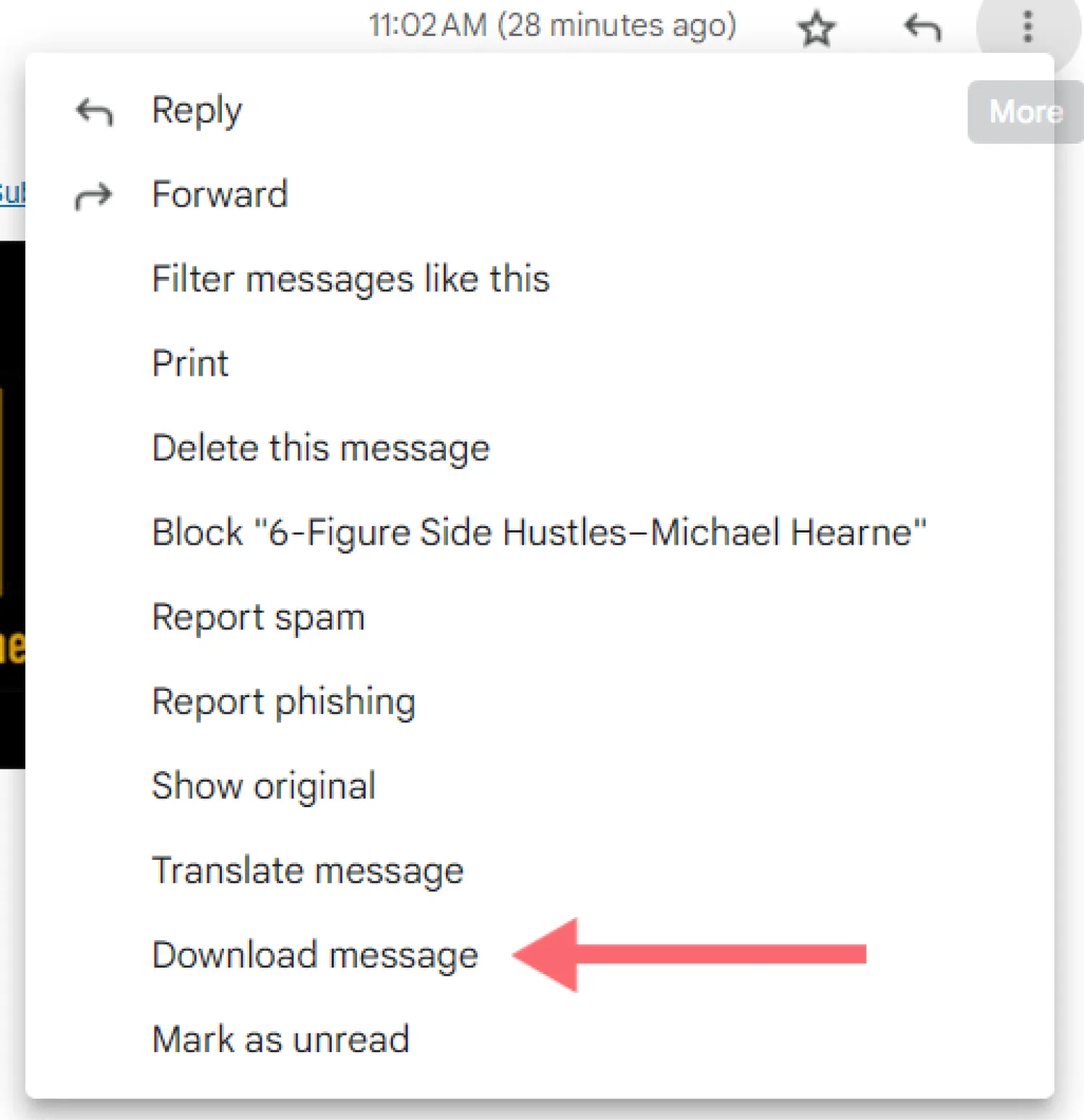 How you download an email depends on which mail provider you use. In Gmail, after opening a message, you can click the three ellipses “…” and then click Download message.