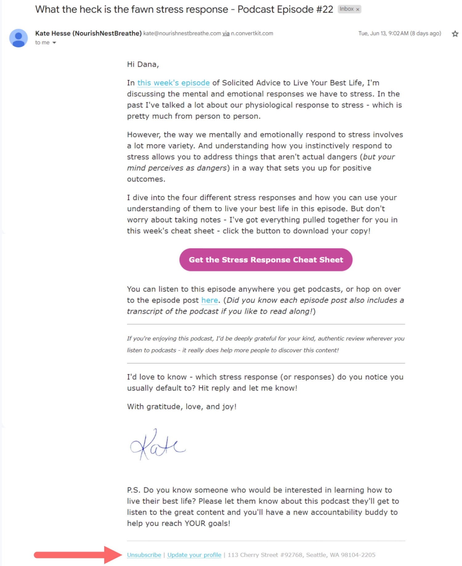 To keep a clean and healthy list, include an easy-to-find one-click unsubscribe link at the bottom of your emails, like coach Kate Hesse does.