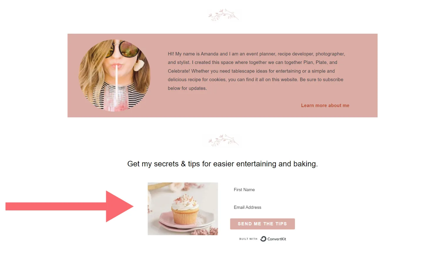 Food blogger Amanda Wilens has a simple opt-in form on her homepage where readers can subscribe to get tips for entertaining and baking.