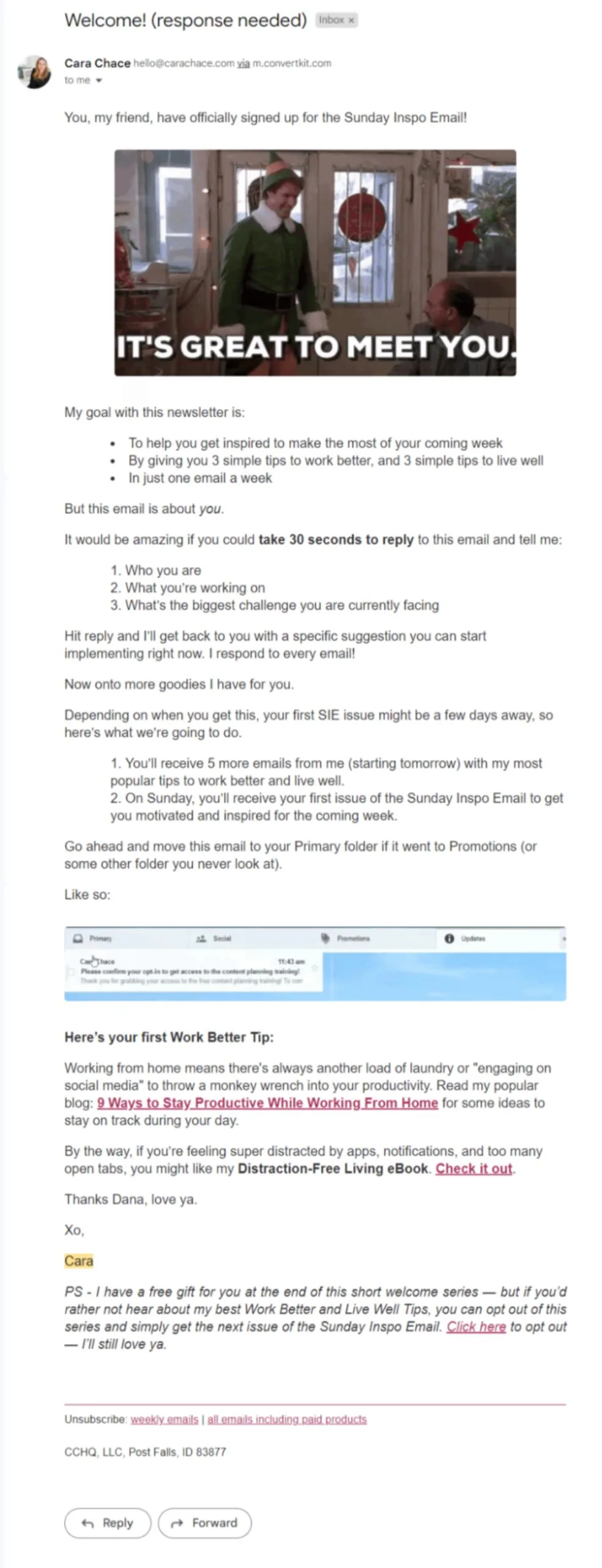 Creator Cara Chace automatically welcomes subscribers to her email list with this welcome email that introduces herself and gives the subscriber a free gift.