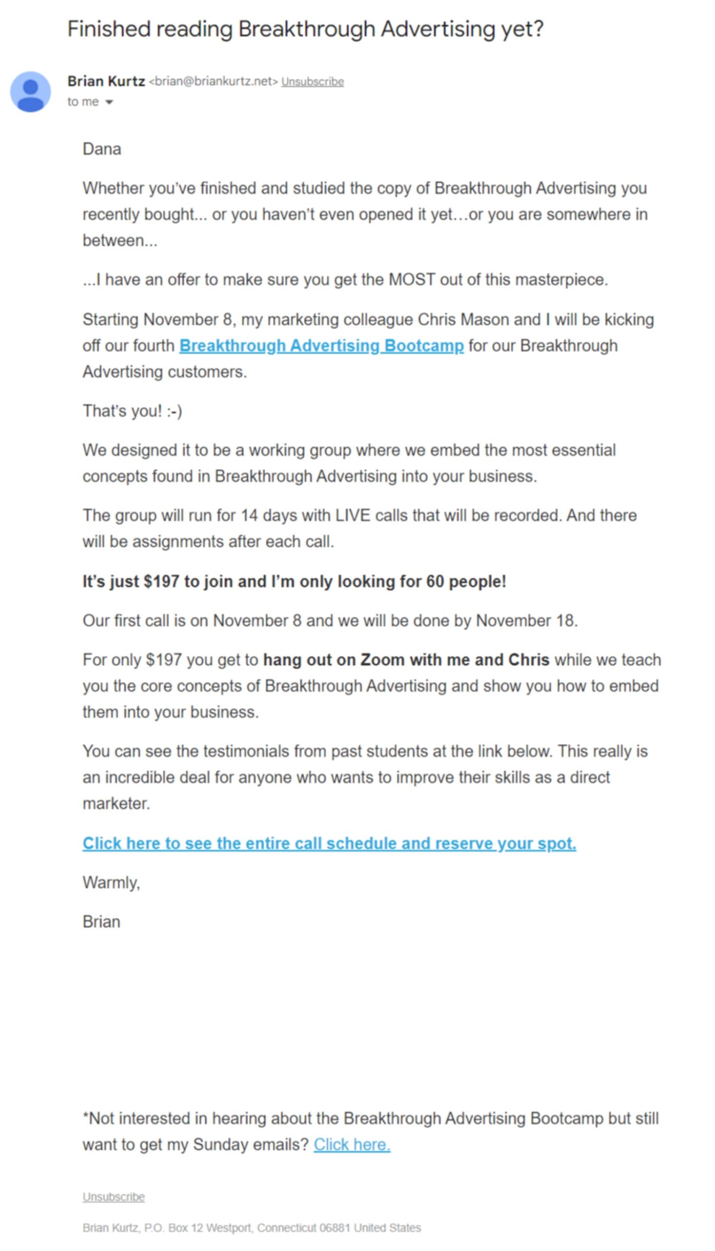 Copywriter Brian Kurtz sent this upsell email to people who purchased a workbook from him.