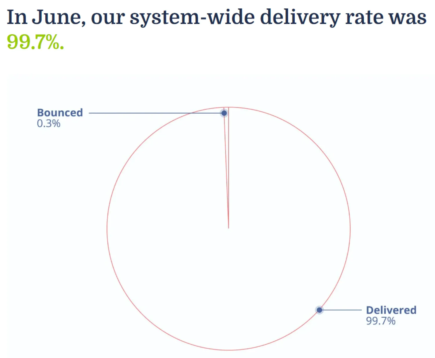 At Kit, we’re transparent about our email delivery rates and publish them monthly. You can see (below) that our delivery rate in June 2023 was 99.7%. This means 99.7% of emails our creators sent were successfully delivered.