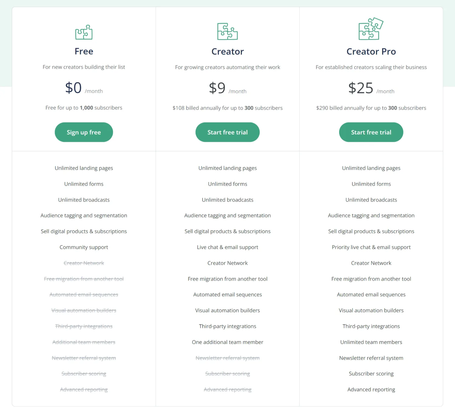 - Paid plans: Start at $9 USD per month (paid annually) for up to 500 subscribers