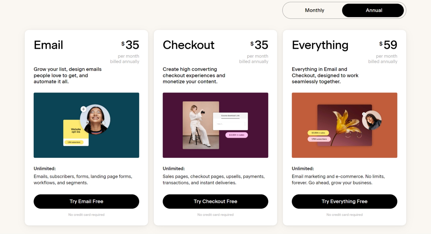 - Paid plans: Start at $35 USD per month (paid annually) for unlimited subscribers
