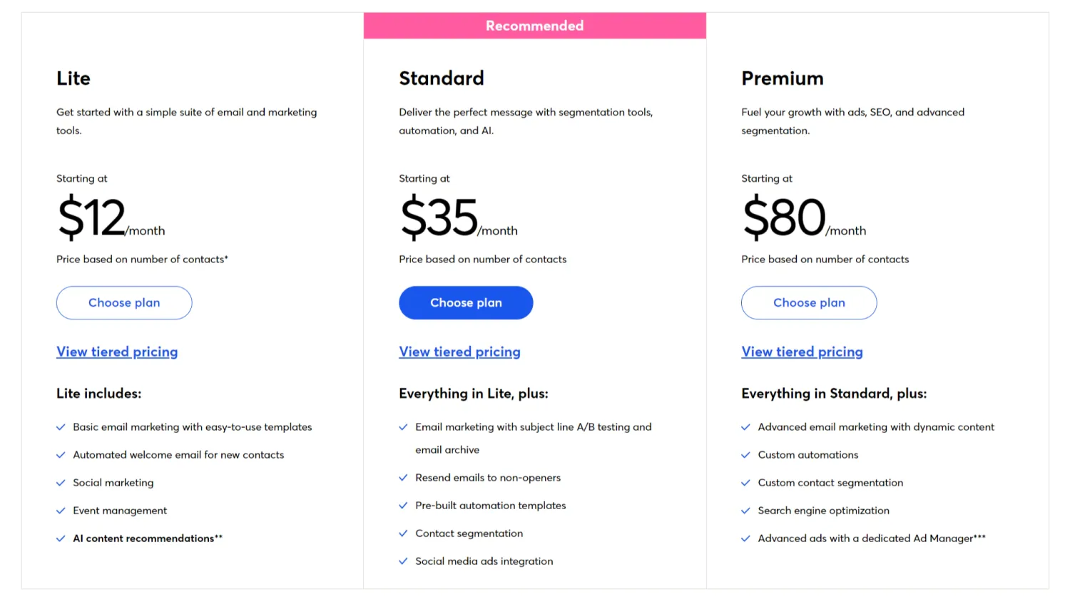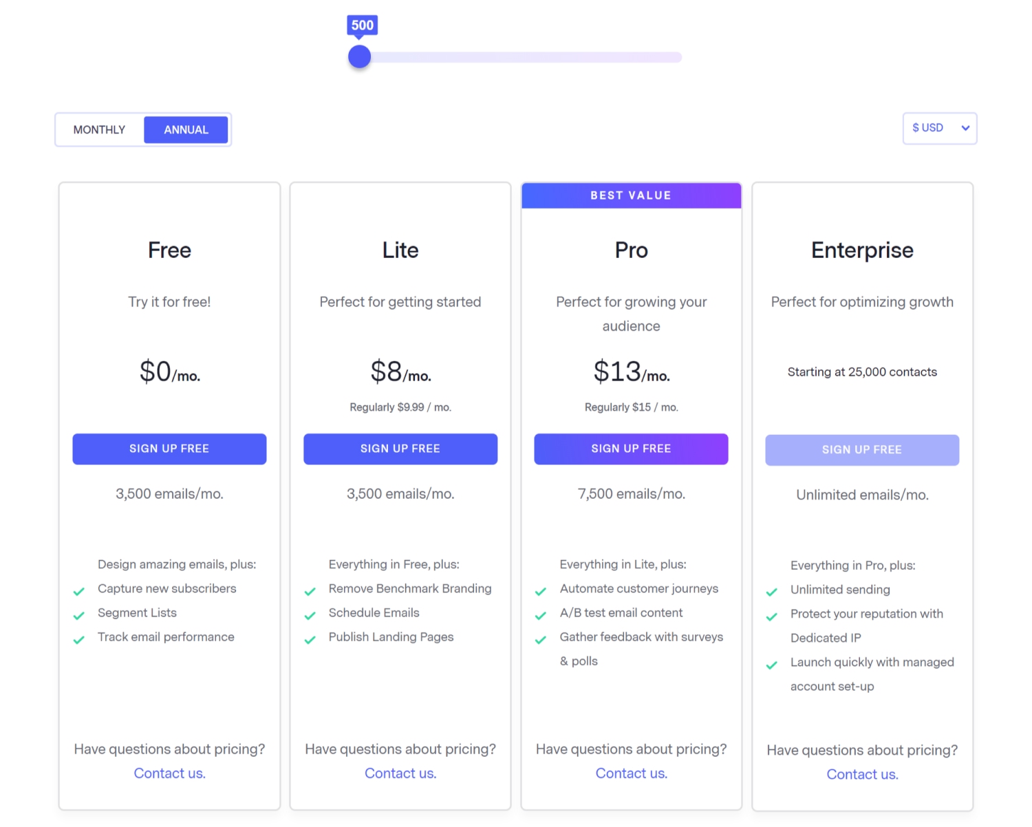 - Free plan: Up to 500 contacts