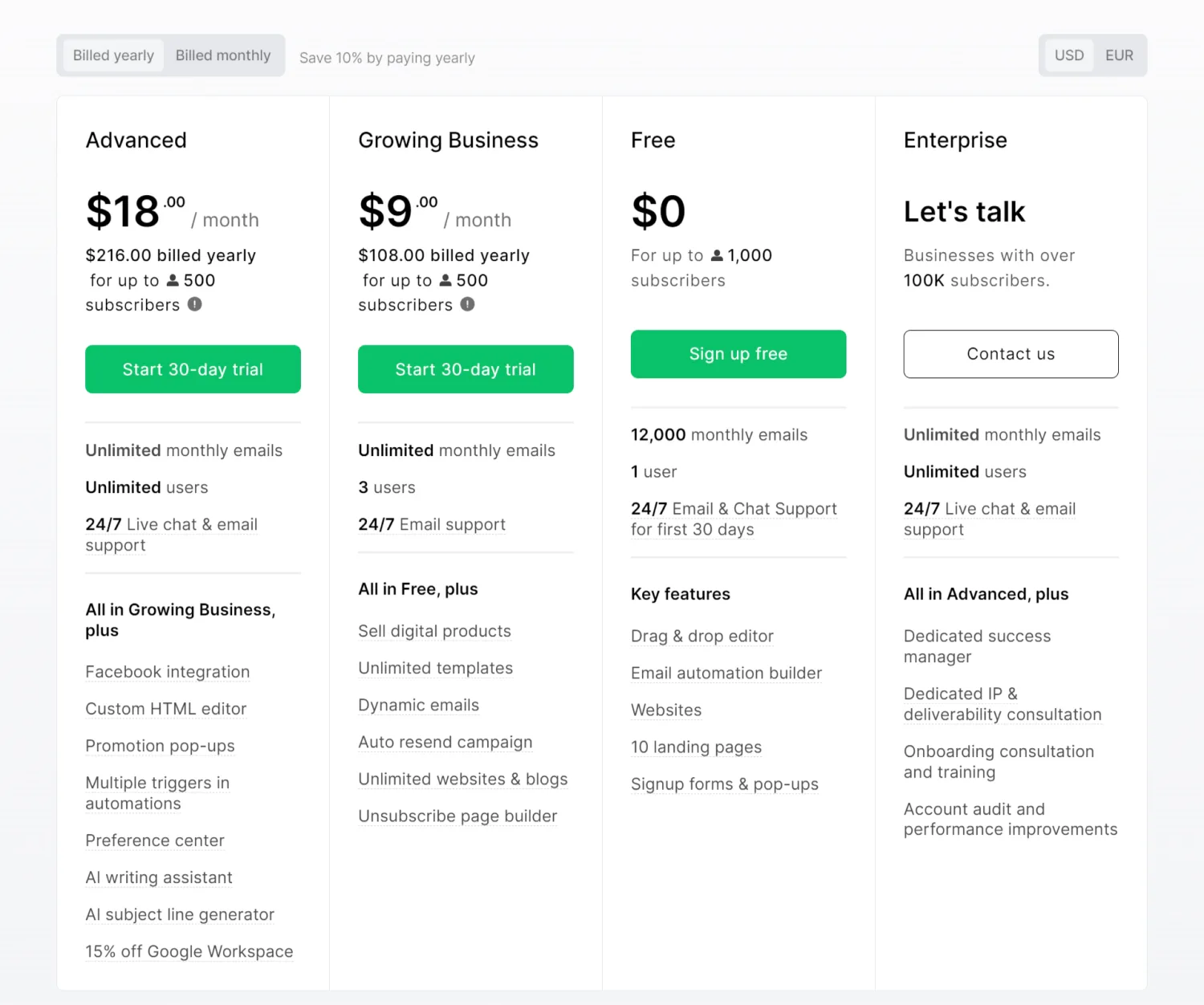 - Paid plans: Start at $25 USD per month (paid annually) for up unlimited subscribers and 20,000 emails/month