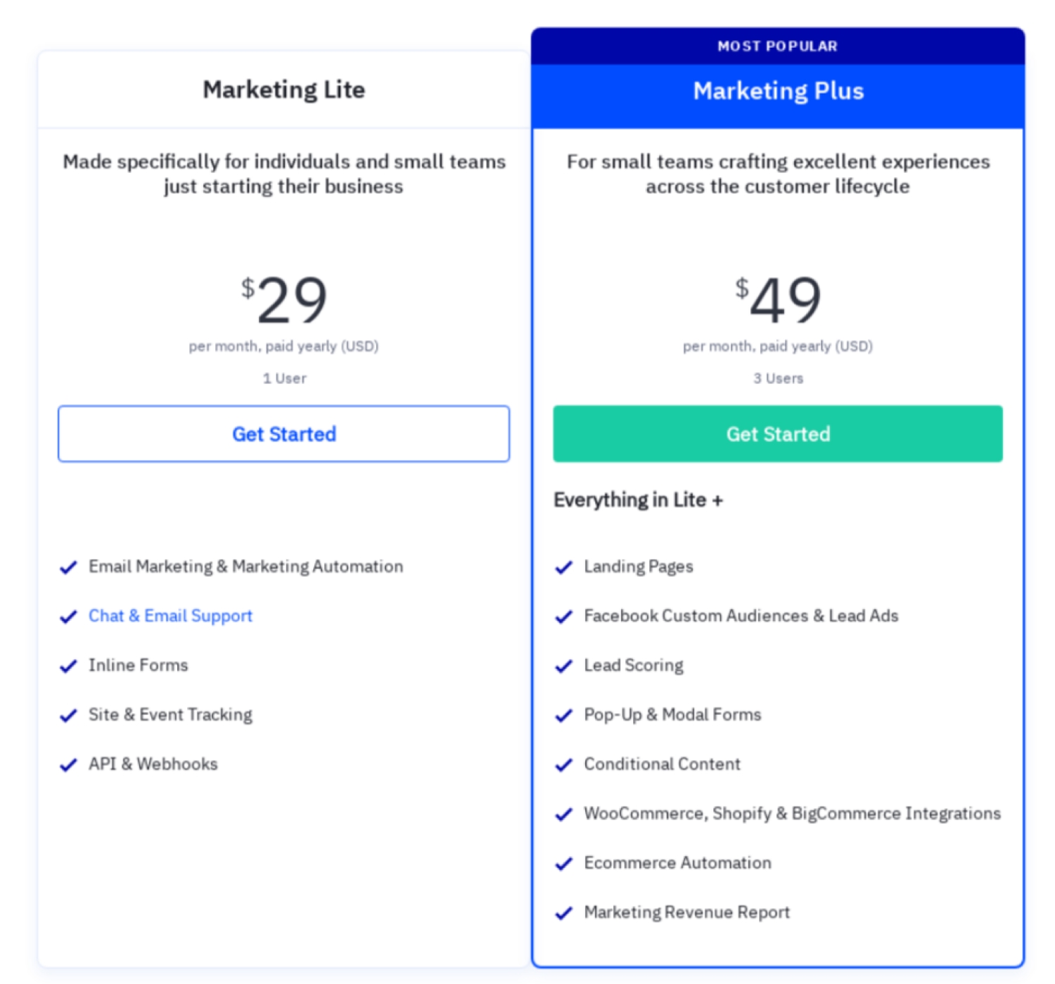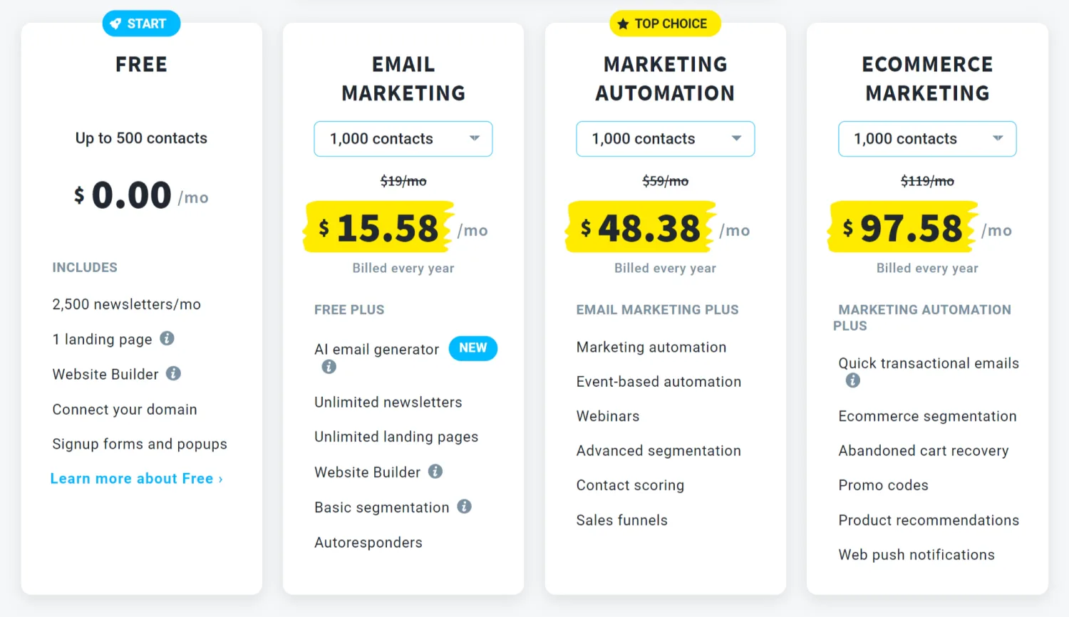 - Paid plans: Start at $15.58 USD per month (paid annually) for up to 1,000 contacts