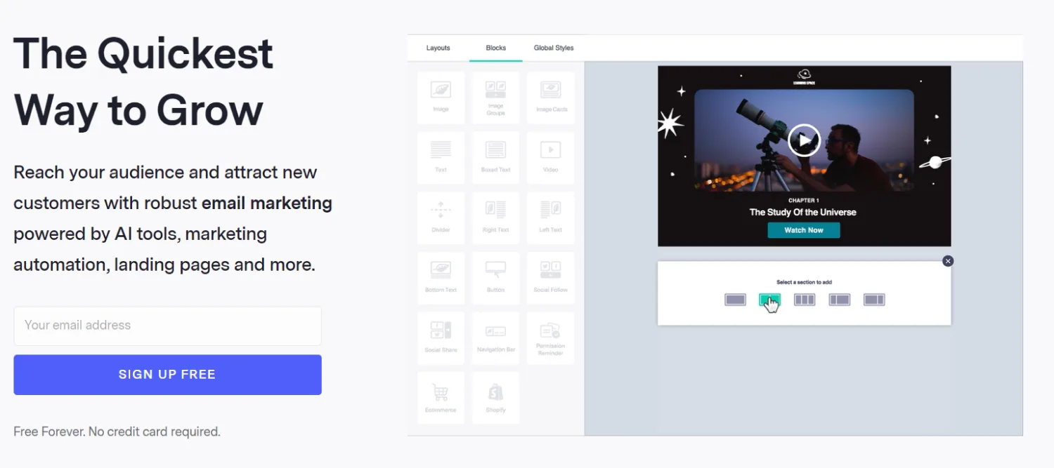 They’re a beginner-friendly email marketing platform that provides the necessary tools for designing newsletters, growing a list, and segmenting subscribers.
