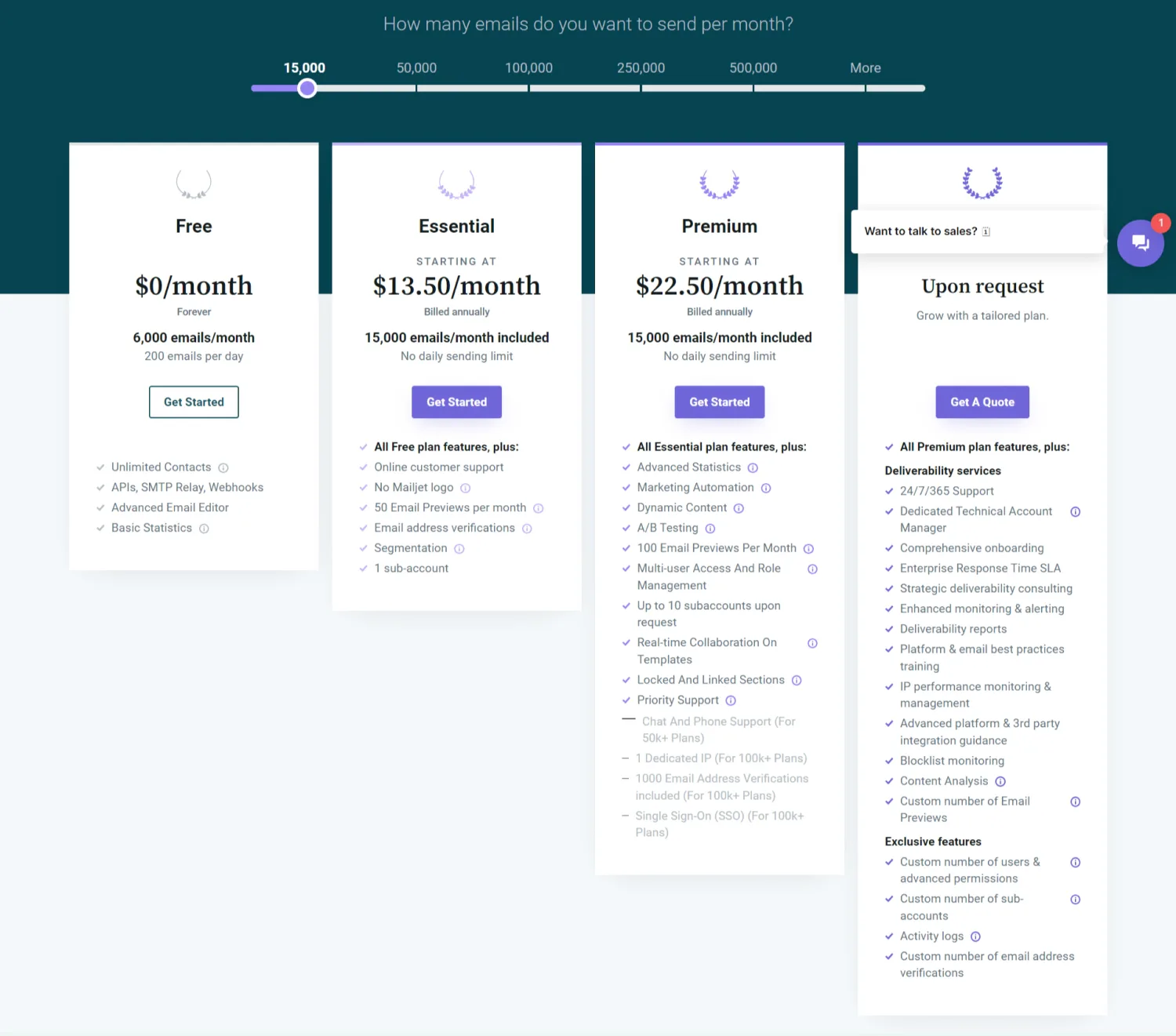 - Paid plans: Start at $13.50 USD per month (paid annually) for up to 15,000 emails sent per month with no daily sending limit
