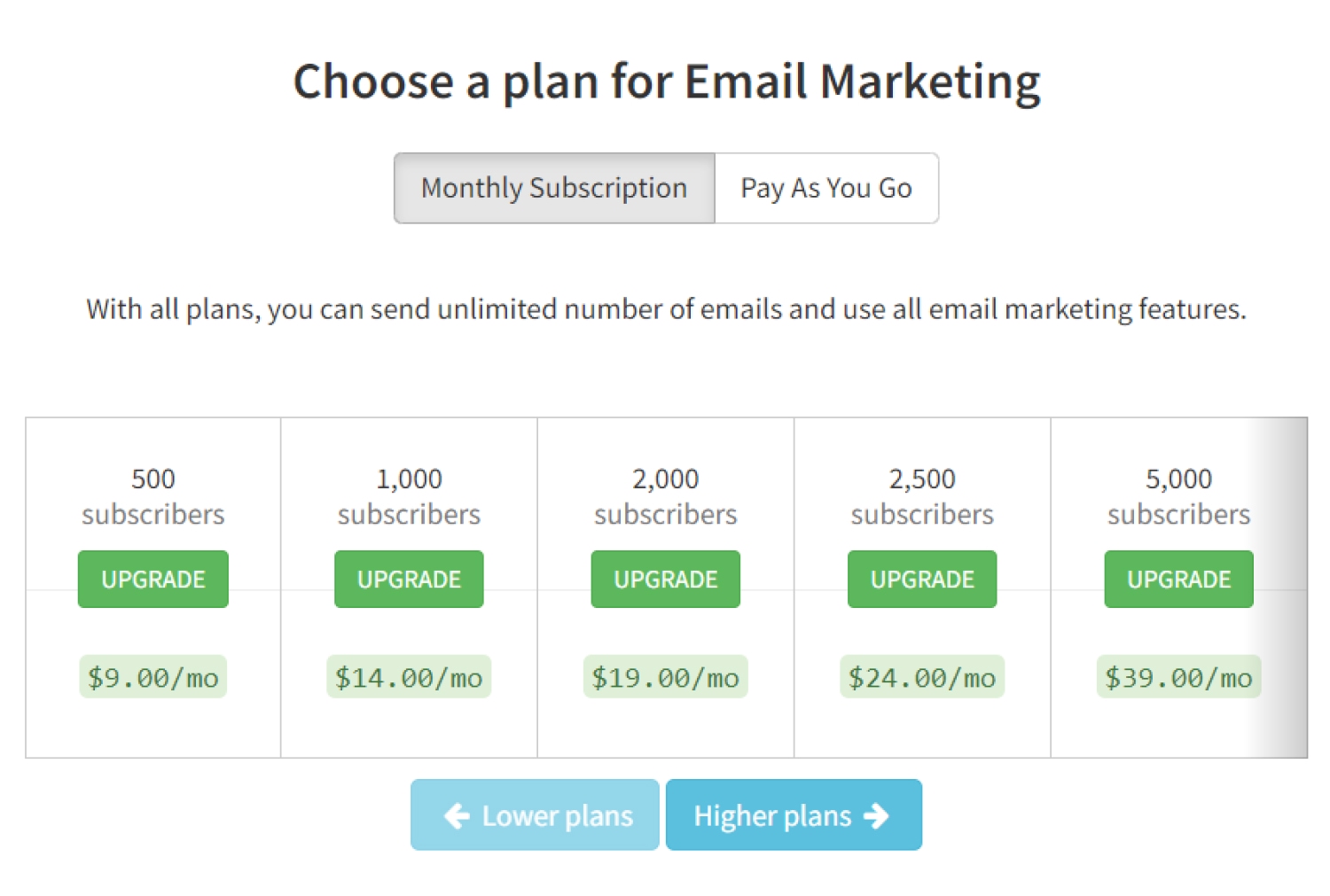 On the other hand, you might be fine paying per email if you only plan to send emails a few times a month to a small list.