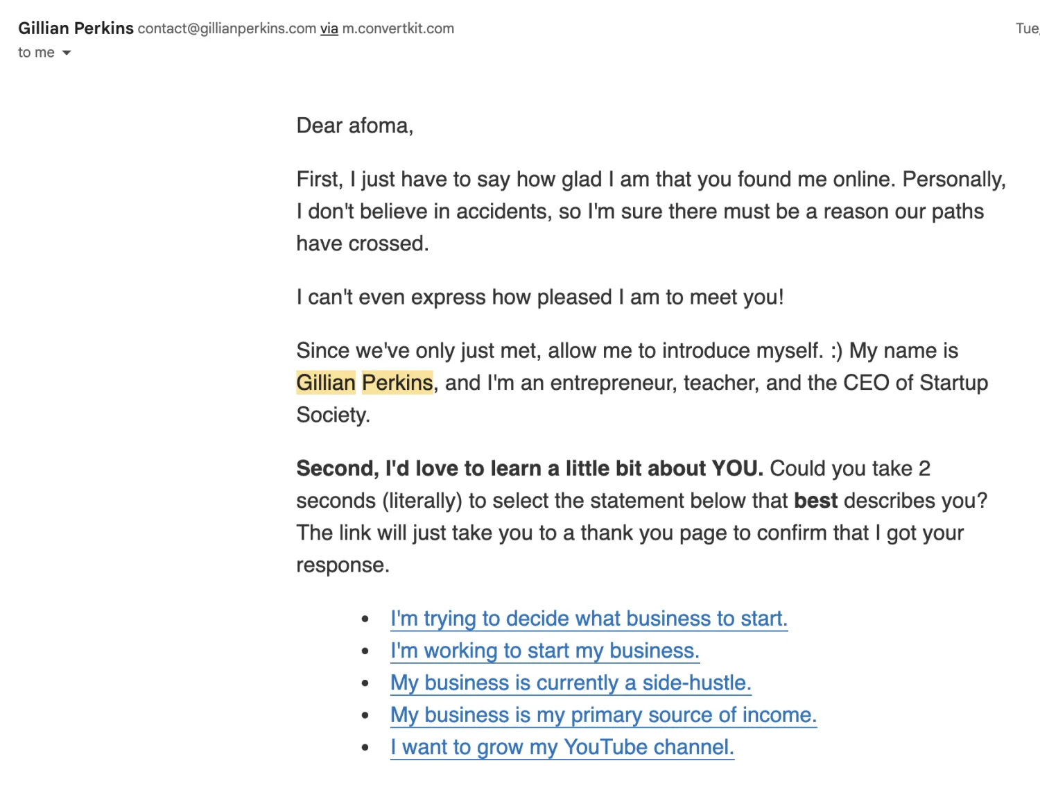 In your introductory email, ask your subscribers what their main struggle is by offering multiple options to choose from. The reader will respond by clicking on the link they identify with.