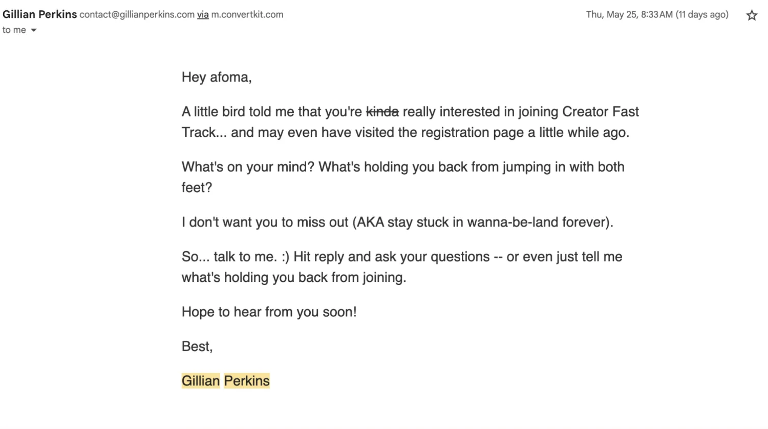 Send them targeted emails, asking what’s holding them back. That’s how you get those abandoned cart emails and what Gillian Perkins did when I clicked the link to her course’s sales page.