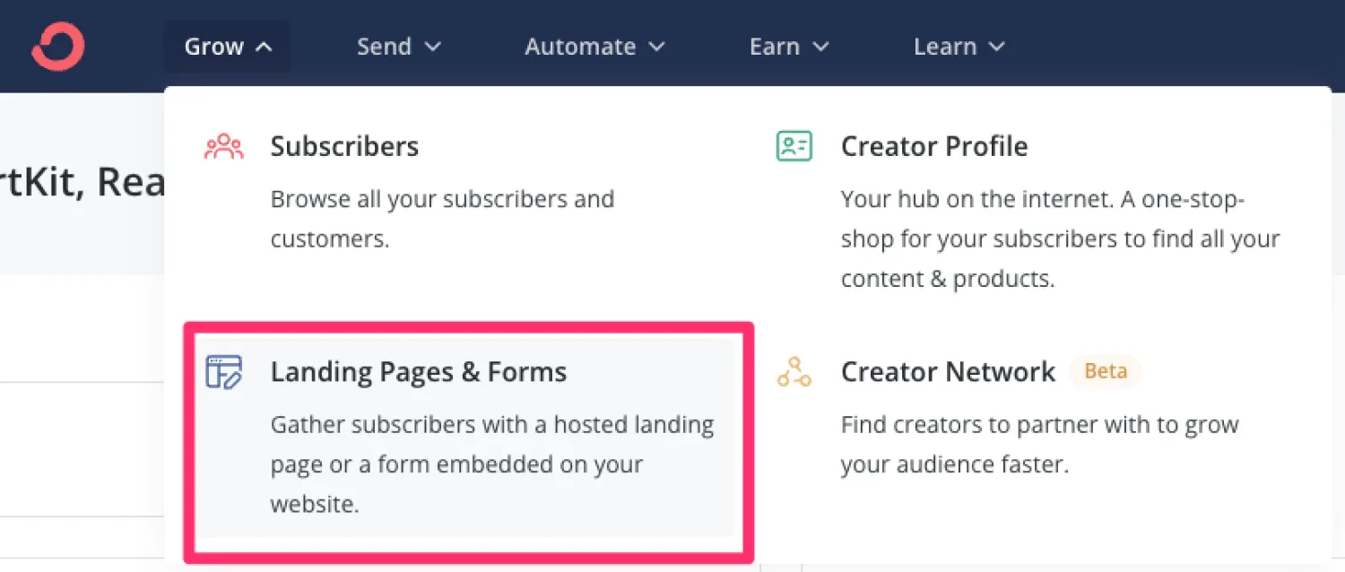 To build a landing page or opt-in form, go to Grow > Landing Pages & Forms and build one using one of Kit’s many templates.