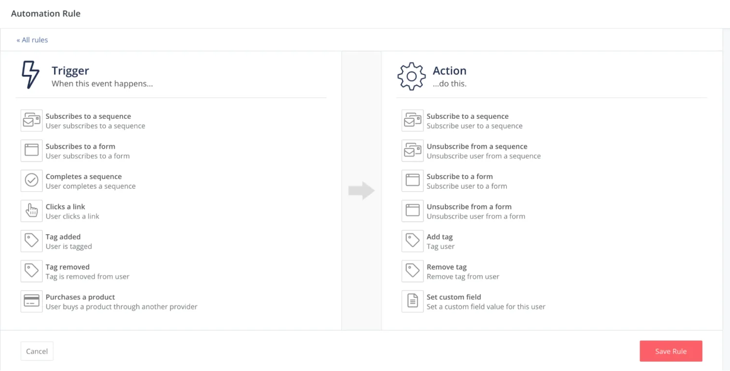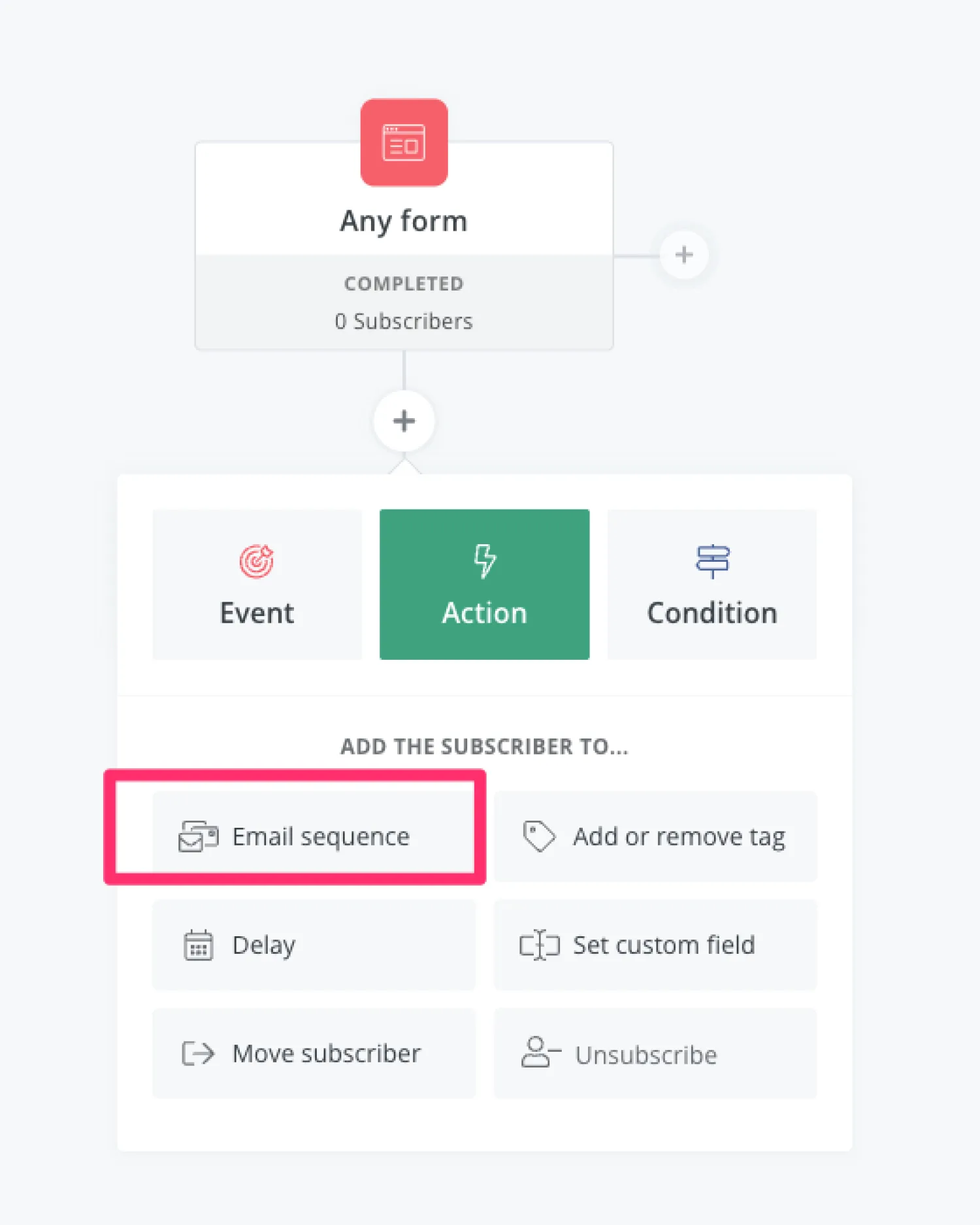 Now you’re ready to choose an Action. From the drop-down, you can choose from a number of options. This includes segmenting your subscriber, subscribing them to an email sequence, tagging them, and more.