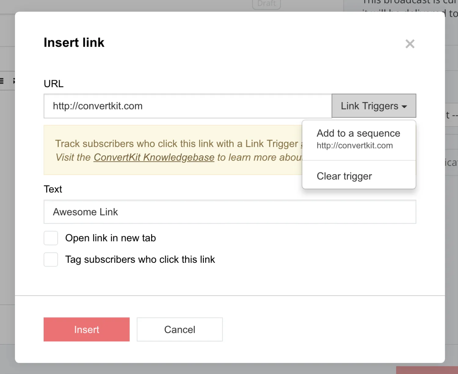 Once you’ve done this, return to your welcome email to connect your Link Trigger Rule. Do this by highlighting the text you want to create a link with and clicking the Link button. You’ll see an option to the right of your URL to create a Link Trigger.