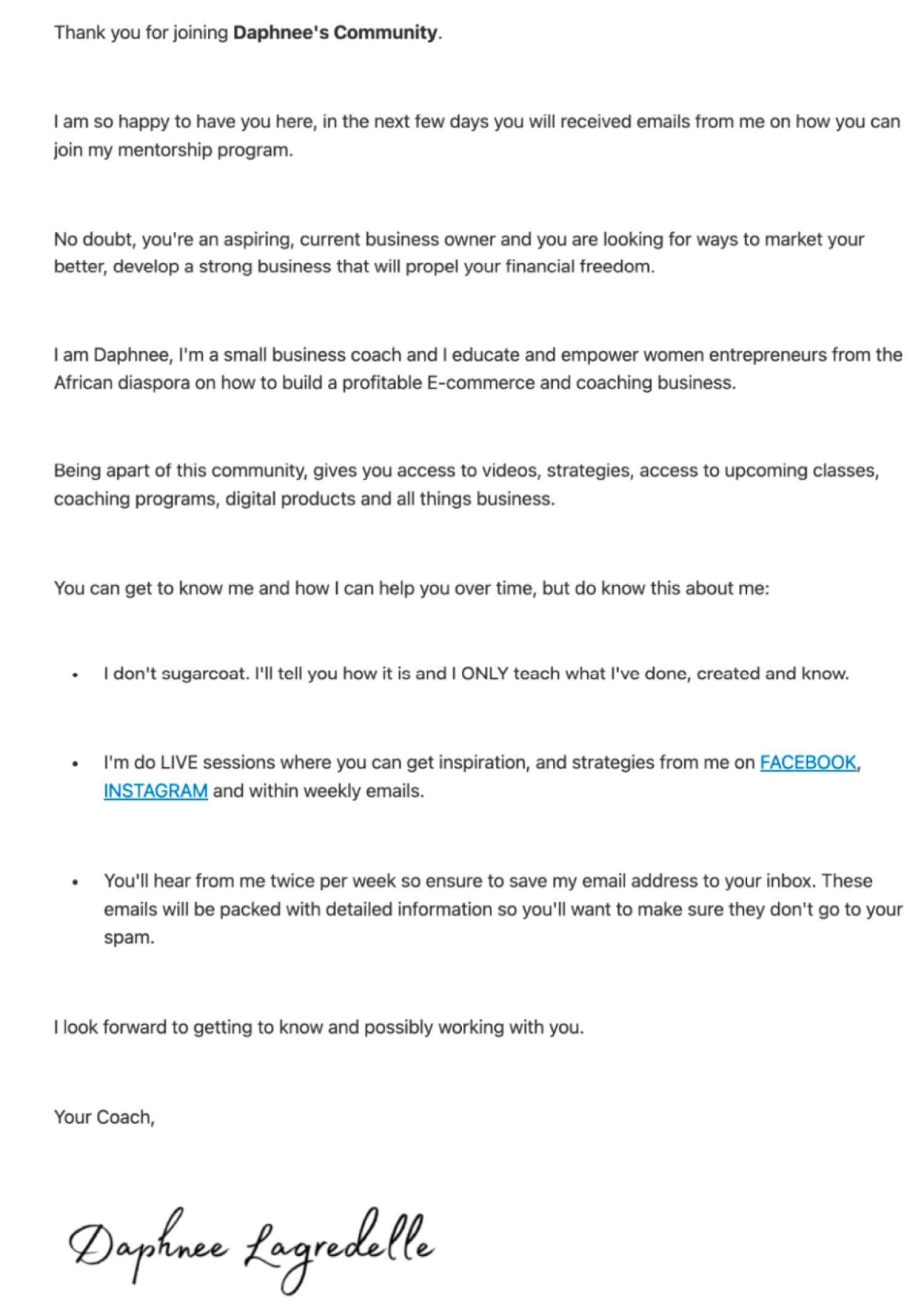 Daphnee’s welcome email is part of her $100K+ coaching business