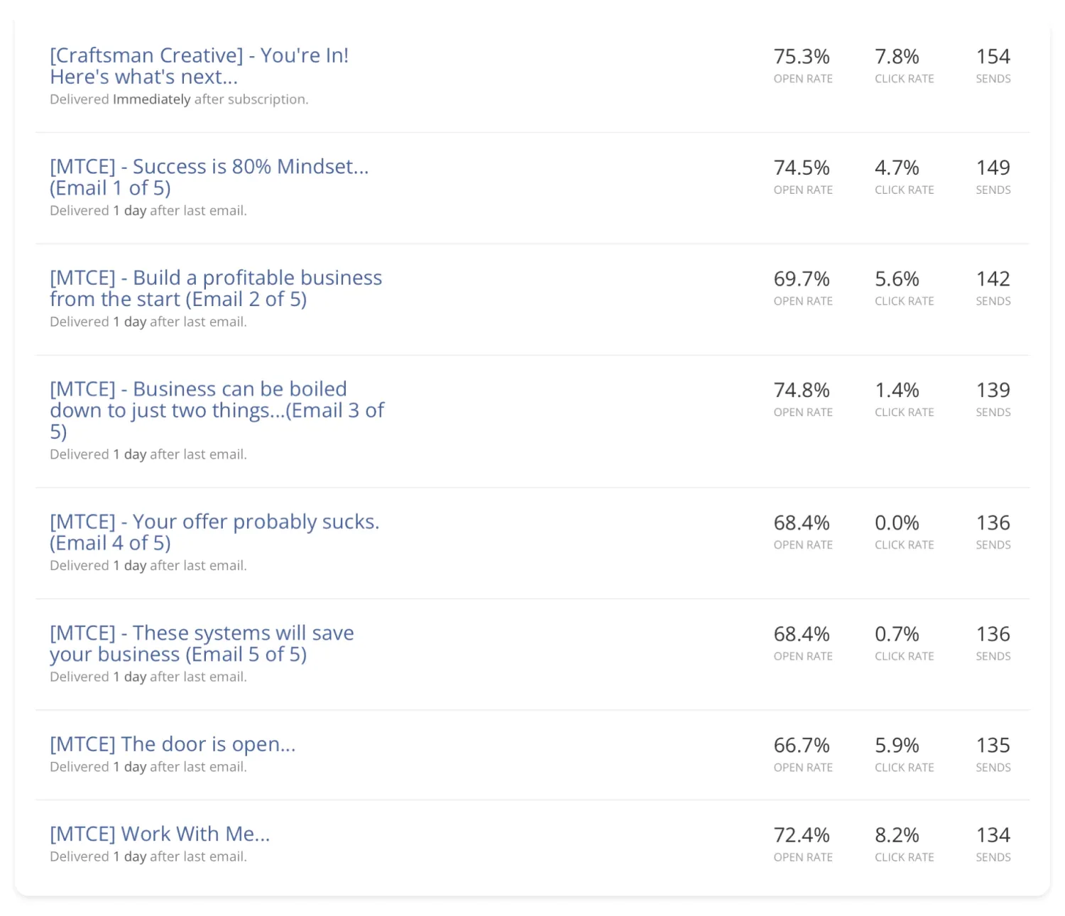 Email sequences save you time because you don’t need to send each message to new subscribers manually. However, you can’t set it and forget it forever. Periodically review your email marketing KPIs like click-through and unsubscribe rates to ensure subscribers still enjoy the content. You can also experiment with new subject lines to increase your email open rate and update messages with your latest content.