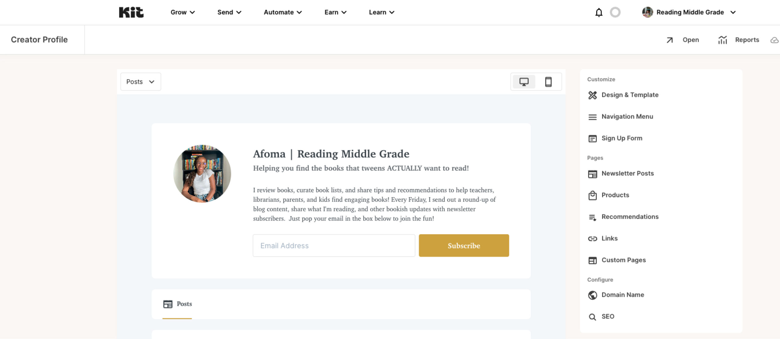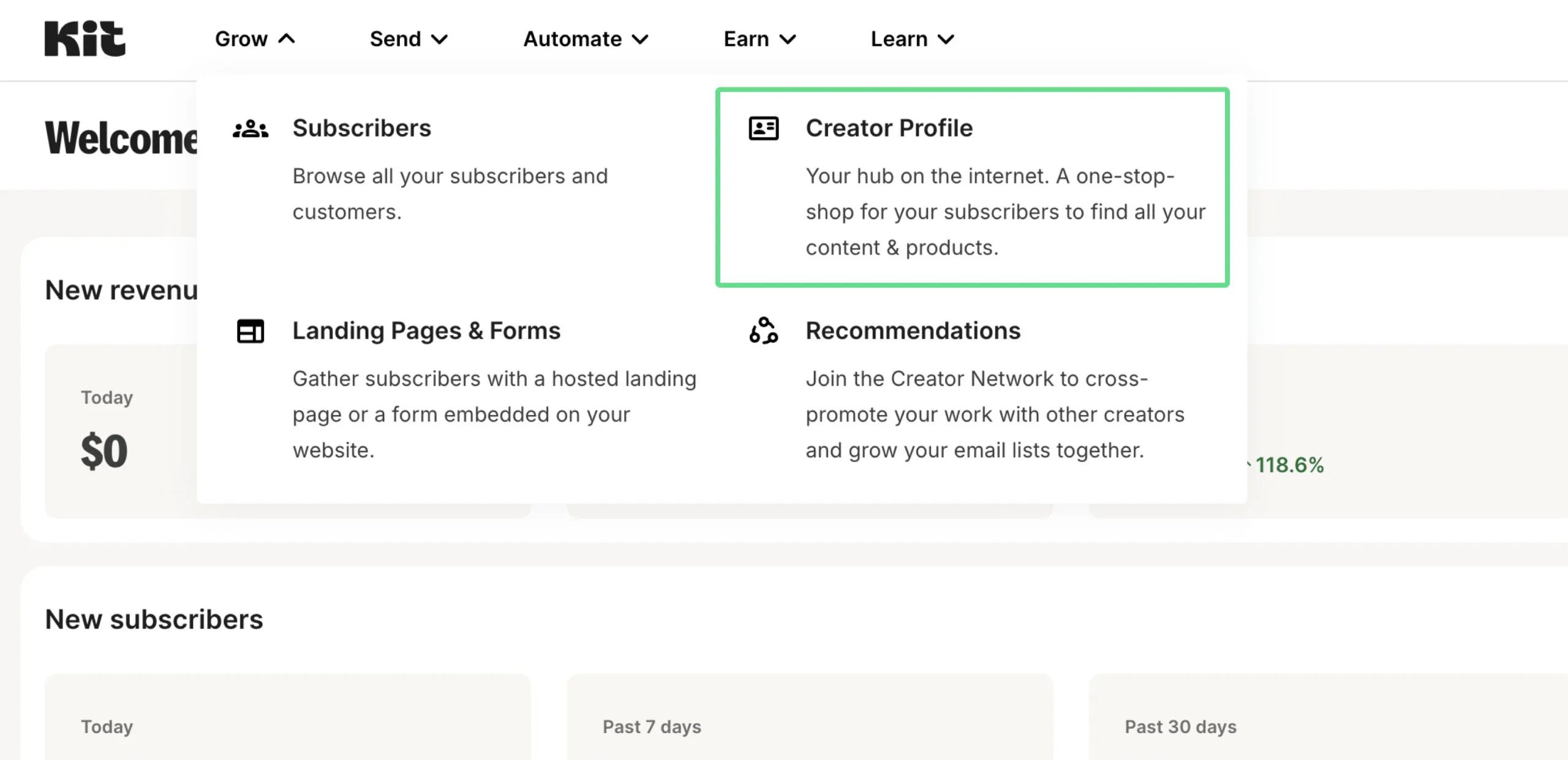 Setting up a profile is easy. If you’re not yet a Kit user, you can sign up on the Creator Network page. If you’re a Kit user, just go to your Kit dashboard and click Grow > Creator Profile.