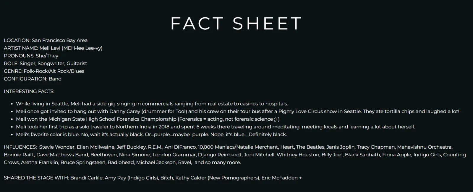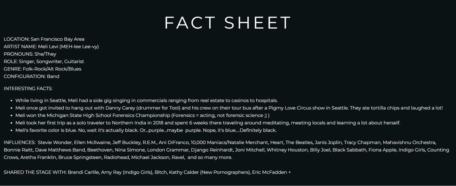 Artist Meli Levi lists their facts in short points so people can scan and gather the info they need without needing to read their entire bio.