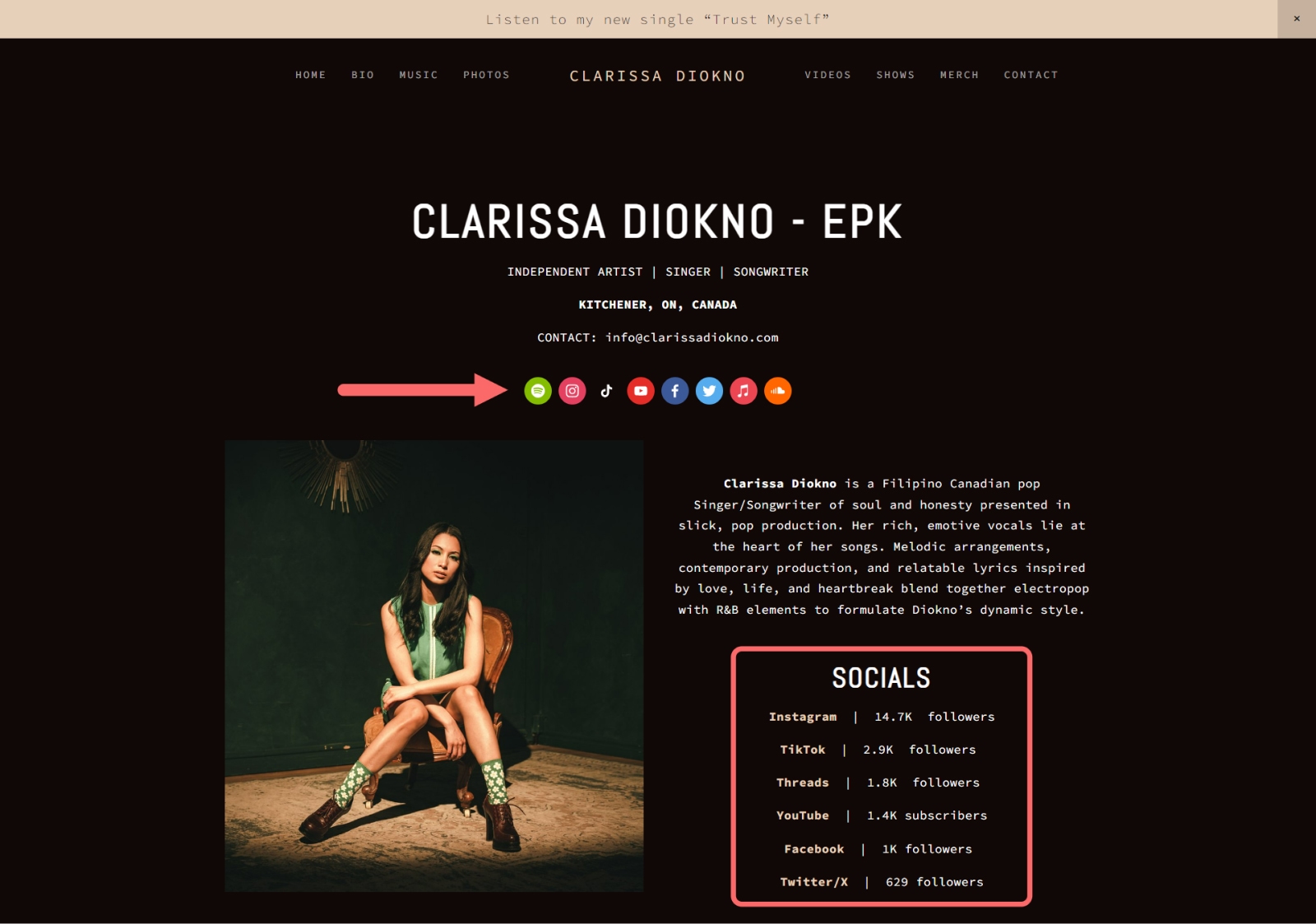 Singer Clarissa Diokno has social icons near the top of her EPK. She also adds the number of followers she has for each social platform to give viewers a glimpse of her reach.