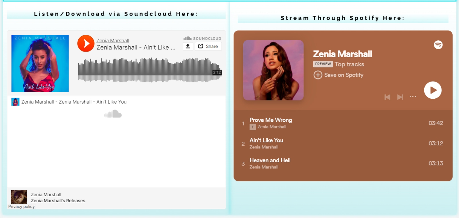 Singer Zenia Marshall offers different options for people to listen to and download her music: