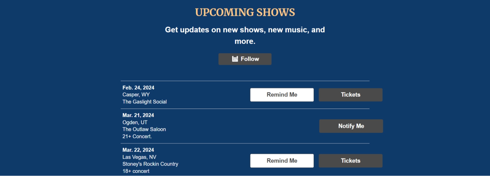 Singer Chancey Williams features his upcoming shows. He also has buttons so people can follow his tours, buy tickets, or get reminders for his shows: