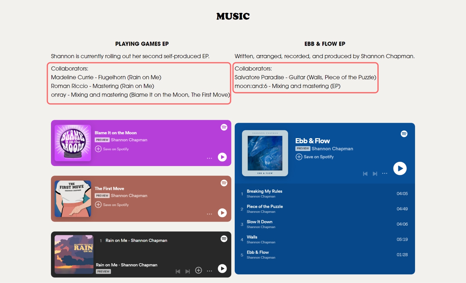 Artist Shannon Chapman’s EPK lists who she collaborated with and who mixed and mastered her songs: