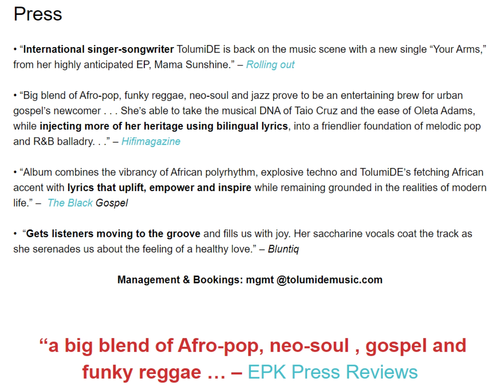 Highlight three to five of your best pieces of coverage, including press from the current album, like singer TolumiDE does: